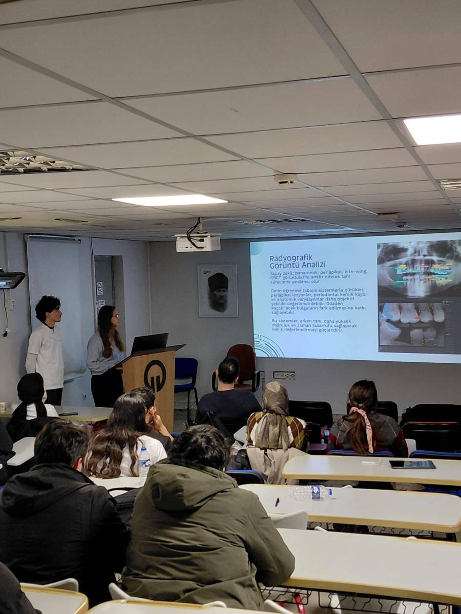 Fakültemiz lisans programı Dönem V derslerinden “USEC504 Kanıta Dayalı Diş Hekimliği” dersi kapsamında, Klinik Bilimler Bölümü Ağız, Diş ve Çene Cerrahisi Anabilim Dalı öğretim üyesi Prof. Dr. Cem ÜNGÖR’ün yürütücülüğünde; Stj. Dt. Mehmet Burak SÜZEN, Stj. Dt. Nazlıcan YILMAZ, Stj. Dt. Mehmet Ali EMİRZEOĞLU, Stj. Dt. Elif Dilara DOĞAN, Stj. Dt. Zihni Berkay EMİRAL, Stj. Dt. Ahmet Süha ÖZTÜRK, Stj. Dt. Mustafa Eren ÇALIK ve Stj.Dt.Mehmet Furkan ALTUNTAŞ'ın katkılarıyla “Yapay Zekâ ve Diş Hekimliği” başlıklı bilgilendirme semineri gerçekleştirilmiştir.