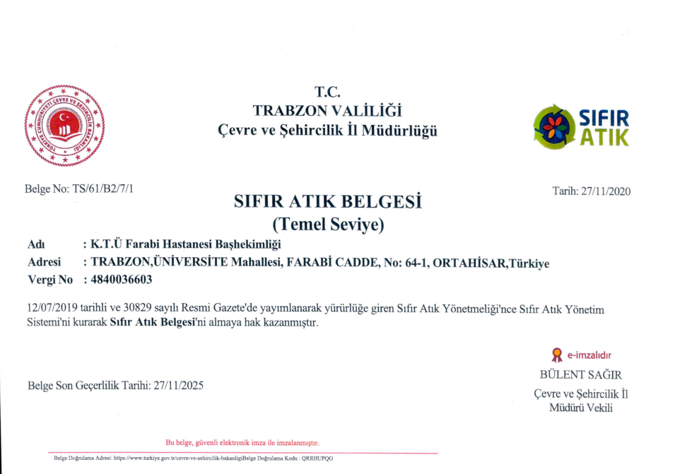 KTÜ Farabi Hastanesi 27.11.2020 Tarihli ve 30829 sayılı Resmi Gazete'de yayımlanarak yürürlüğe giren Sıfır Atık Yönetmeliği'ince Sıfır Atık Yönetim Sistemi'ni Kurarak Sıfır Atık Belgesi'ni almaya hak kazandı.