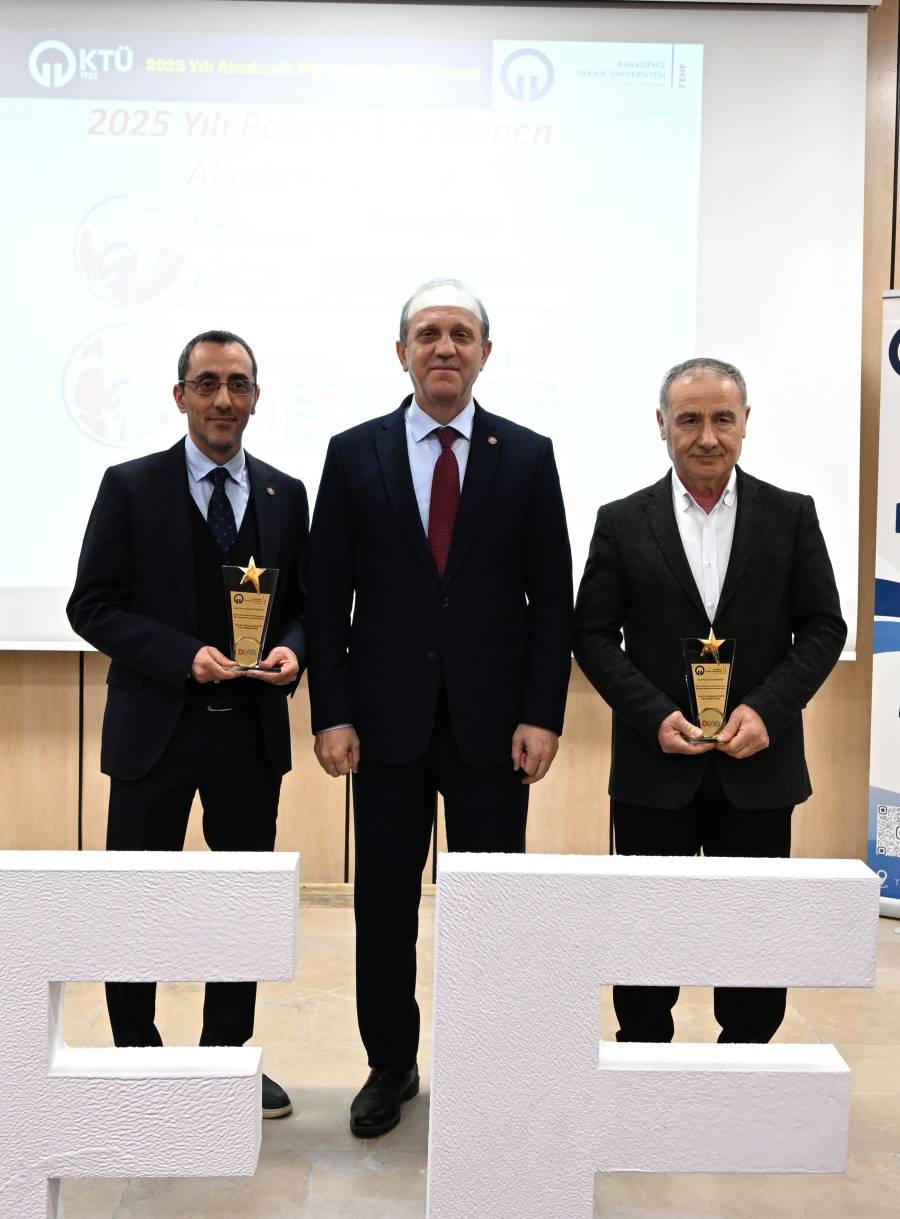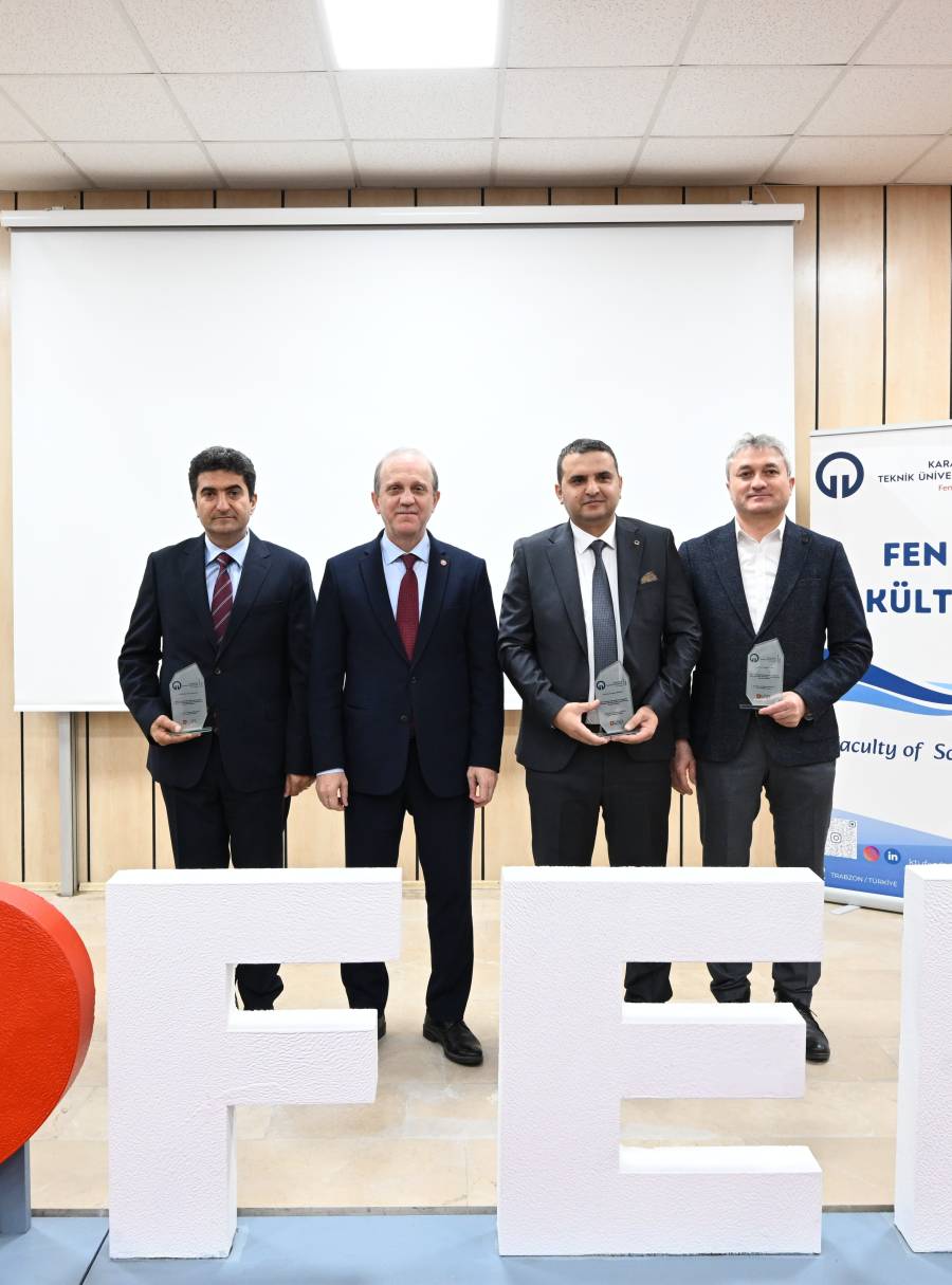 Törene Rektörümüz Prof. Dr. Hamdullah ÇUVALCI, Rektör Yardımcıları Prof. Dr. Ali TEMİZ, Prof. Dr. Ömer Faruk URSAVAŞ, Fakültemiz Dekanı Prof. Dr. Ali Osman BELDÜZ, dekan yardımcıları ile akademik ve idari personel katıldı. Program, saygı duruşu ve İstiklal Marşı’nın ardından Dekanımız Prof. Dr. Ali Osman BELDÜZ’ün fakültemizin 2025 yılı akademik performansını açıklayan sunumuyla başladı. KTÜ Rektör Prof. Dr. Hamdullah ÇUVALCI, törende yaptığı konuşmada akademik başarılarından dolayı öğretim üyelerini tebrik ederek, KTÜ’nün bilimsel üretkenliğine katkı sunan tüm akademisyenlere teşekkür etti. Konuşmaların ardından ödül takdimlerine geçildi.