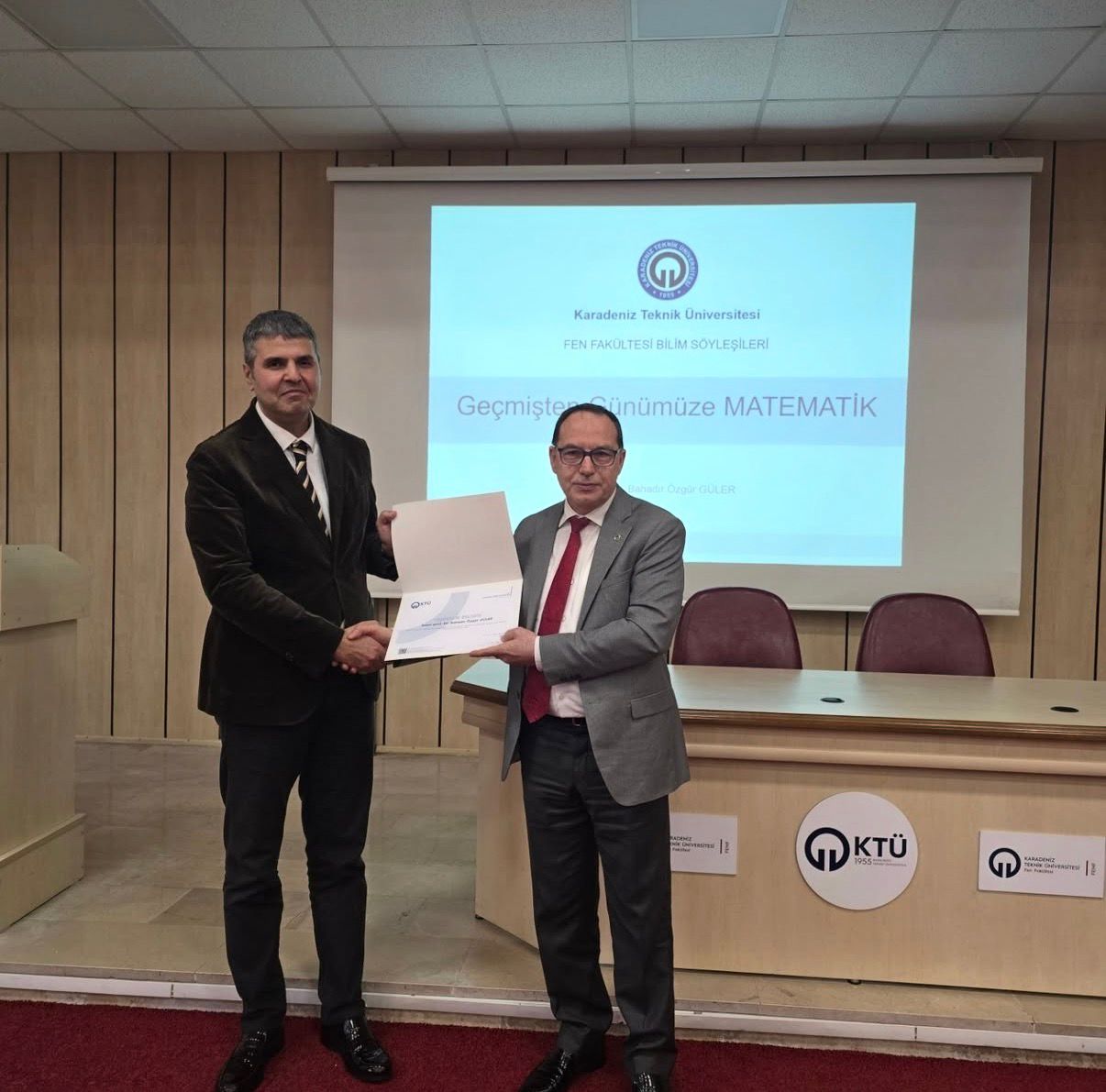 Etkinlik boyunca öğrenciler ve akademisyenler büyük bir ilgiyle sunumu takip ederken, söyleşi interaktif bir atmosferde ilerledi. Matematiğin farklı disiplinlerle olan ilişkisi üzerine dikkat çekici değerlendirmelerin yapıldığı oldukça verimli ve keyifli bir söyleşi gerçekleştirildi. Program sonunda konuşmacıya Dekanımız Sayın Prof. Dr. Ali Osman BELDÜZ tarafından teşekkür belgesi takdim edilerek etkinlik sonlandırıldı.
