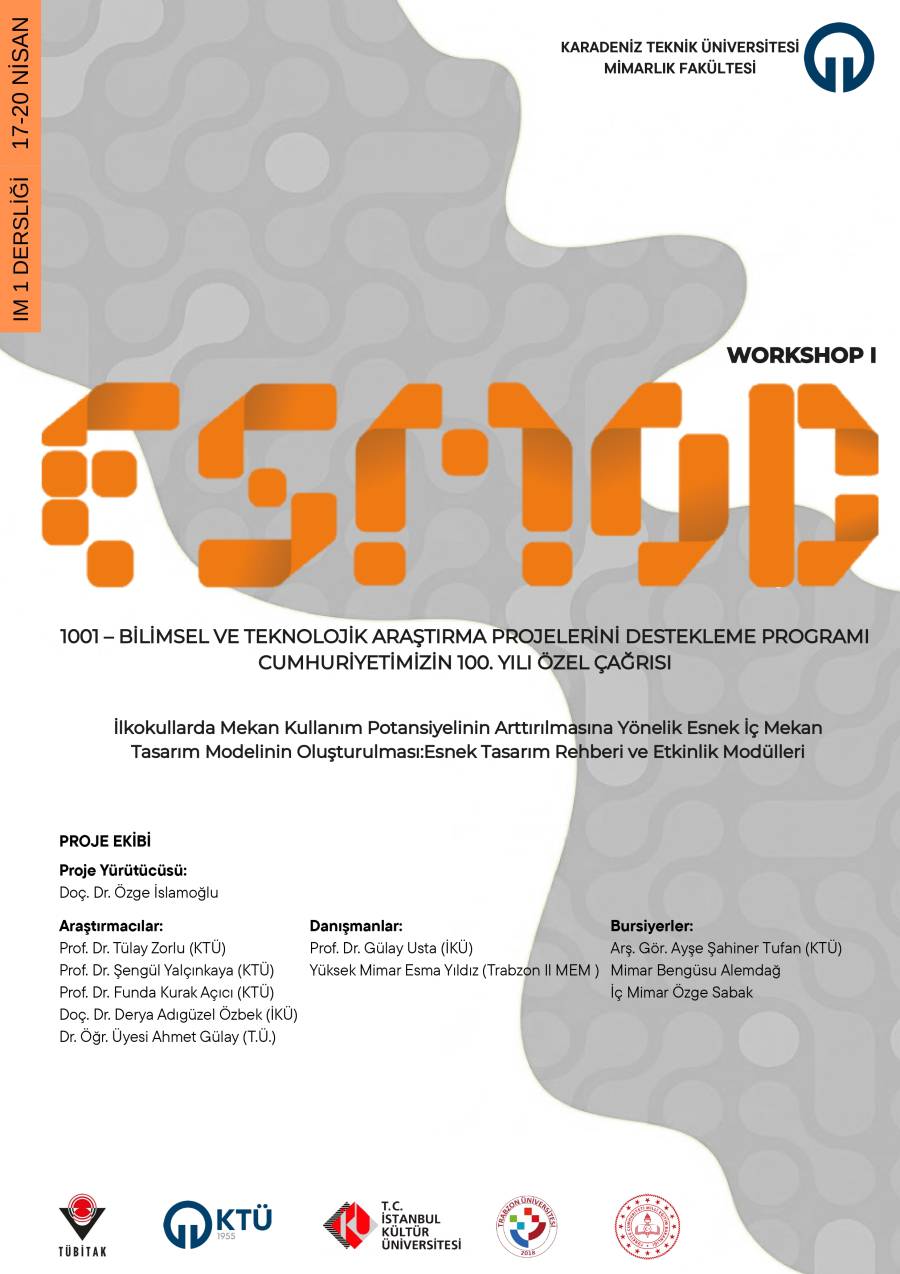 TÜBİTAK 1001 programı kapsamında desteklenen, “İlkokullarda Mekân Kullanım Potansiyelinin Artırılmasına Yönelik Esnek İç Mekân Tasarım Modelinin Oluşturulması: Esnek Tasarım Rehberi ve Etkinlik Modülleri” başlıklı çalışma çerçevesinde, 17.04.2026 tarihinde saat 10.45’te, KTÜ İç Mimarlık Bölümü IM1 dersliğinde bir workshop etkinliği planlanmıştır.