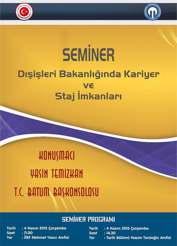 T.C. Batum Başkonsolosu Yasin TEMİZKAN' ın Verdiği "Dış İşleri Bakanlığında Staj ve Kariyer İmkanları Konulu Seminer" 4 Kasım 2015 Çarşamba Günü Saat 11.00' de Fakültemiz M. Yazıcı Amfisinde Yapıldı.