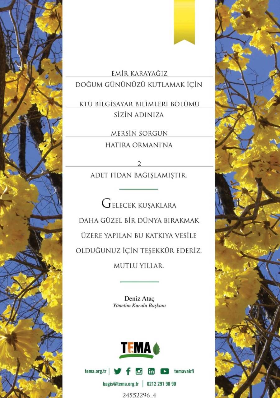 Bu etkinlik kapsamında, doğum günü vesilesiyle gerçekleştirilen geleneksel ikram organizasyonları yerine, kaynak israfının önlenmesi ve çevresel sürdürülebilirliğe katkı sağlanması amacıyla TEMA Vakfı aracılığıyla fidan bağışı yapılması tercih edilmiştir. Bu doğrultuda, bölümümüz çalışanlarından Arş Gör. Emir KARAYAĞIZ adına Mersin Sorgun Hatıra Ormanı’na 2 adet fidan bağışı gerçekleştirilmiştir.