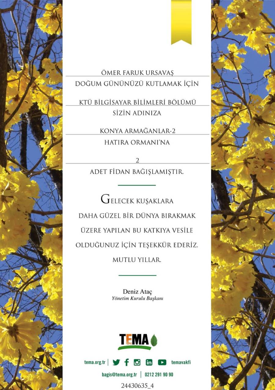 Bu etkinlik kapsamında, doğum günü vesilesiyle gerçekleştirilen geleneksel ikram organizasyonları yerine, kaynak israfının önlenmesi ve çevresel sürdürülebilirliğe katkı sağlanması amacıyla TEMA Vakfı aracılığıyla fidan bağışı yapılması tercih edilmiştir. Bu doğrultuda, bölümümüz çalışanlarından Prof. Dr. Ömer Faruk URSAVAŞ adına Konya Armağanlar-2 Hatıra Ormanı’na 2 adet fidan bağışı gerçekleştirilmiştir.