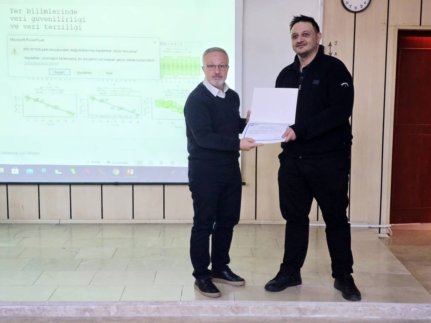 Bölümümüz 2025-2026 Bahar Yarıyılı Seminer Programı kapsamında ilk seminer misafir araştırmacımız Dr. Murat TAMER tarafından verildi. "Termokronoloji methodolojisi, bazı düşük sıcaklık uygulama alanları, veri saydamlığı ve güvenilirliği" başlıklı sunumunu gerçekleştiren Dr. Murat Tamer'e Bölüm Başkanımız tarafından teşekkür belgesi verildi.
