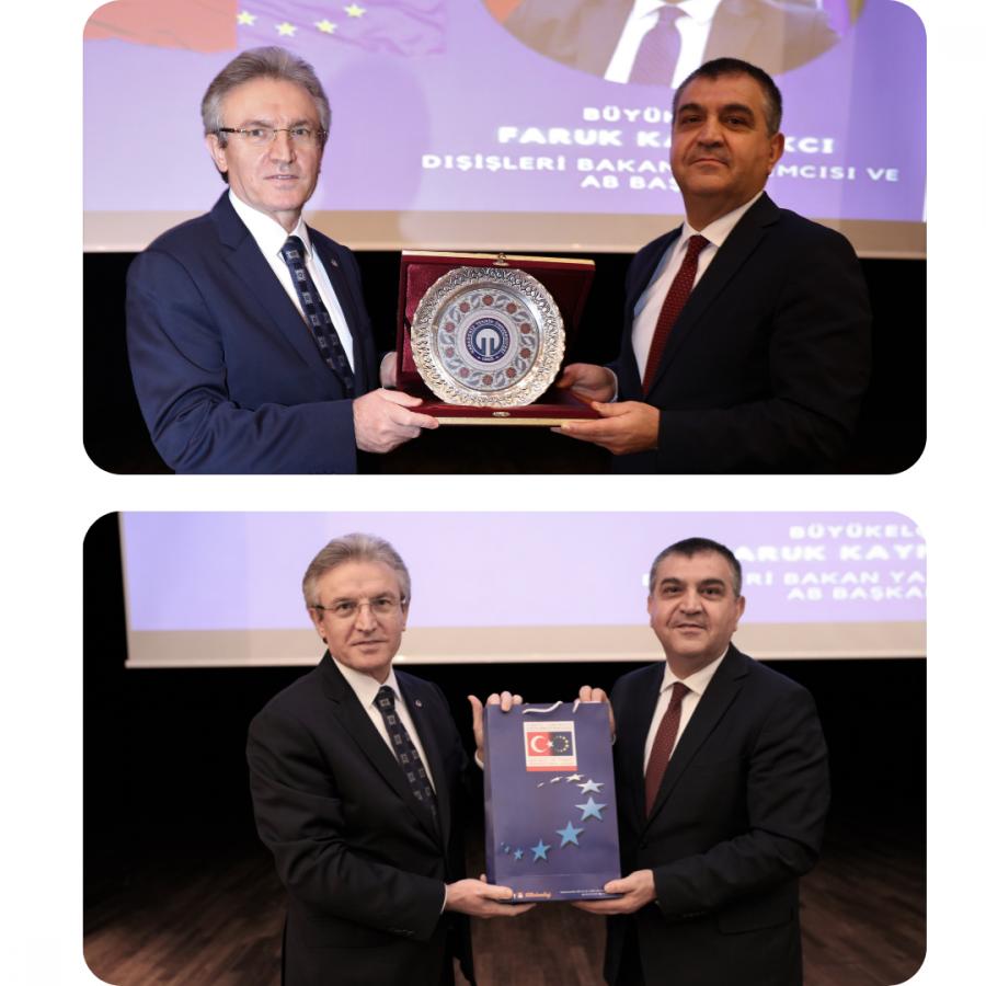 Sayın Büyükelçi Faruk KAYMAKÇI, interaktif bir yöntemle salondaki katılımcıların AB’ye bakış açısını değerlendirerek konuşmalarına başladı. Türkiye’nin AB’ye katılım sürecine dair beklentilerini dile getiren konuşmacımız, vatandaşlarımız tarafından konu hakkında sıklıkla duyulan endişeleri açıklığa kavuşturdu. AB’ye katılımın Türkiye’ye ticari, ekonomik, siyasi ve daha birçok açıdan fayda sağlayacağını, sosyal ve kültürel olarak zaten bir parçası haline geldiğimiz batı medeniyetine adapte olmakta zorlanmayacağımızı aktaran KAYMAKÇI, ayrıca olası bir katılımın gençler için ne gibi fırsat kapılarını aralayabileceğine dair bir bilgilendirme de gerçekleştirdi. Etkinliğimiz, katılımcıların sorularının yanıtlanması ve Rektör Yardımcısı Prof. Dr. Halil İbrahim OKUMUŞ tarafından konuşmacımıza plaket takdimi gerçekleştirilmesi ile sona erdi.
