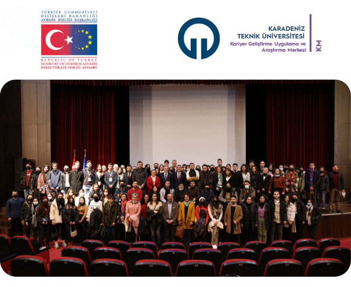 Türkiye Cumhuriyeti Dışişleri Bakanlığı Avrupa Birliği Başkanlığı ve KTÜ Kariyer Geliştirme Uygulama ve Araştırma Merkezi işbirliğiyle düzenlenen “AB Sürecimiz ve Gençler İçin Fırsatlar” başlıklı etkinliğimiz 24 Aralık 2021 saat 16:30’da Dışişleri Bakan Yardımcısı & AB Başkanı Büyükelçi Faruk KAYMAKÇI’nın sunumuyla Prof. Dr. Osman Turan Kültür ve Kongre Merkezi’nde sosyal mesafe, maske ve hijyen kurallarına uygun olarak gerçekleştirildi. Karadeniz Teknik Üniversitesi Rektör Yardımcısı Prof. Dr. Halil İbrahim OKUMUŞ ve Kariyer Geliştirme Uygulama ve Araştırma Merkezi Müdürü Prof. Dr. Hülya KALAYCIOĞLU, Müdür Yrd. Öğr. Gör. Ahmet KÜÇÜK’ün katılımlarıyla, KTÜ Kariyer Geliştirme Uygulama ve Araştırma Merkezi stajyeri Zeynep KÜÇÜK BAYRAK’ın moderatörlüğünde gerçekleştirilen etkinliğimize akademisyen ve öğrencilerden oluşan 428 kişi katılım sağladı.