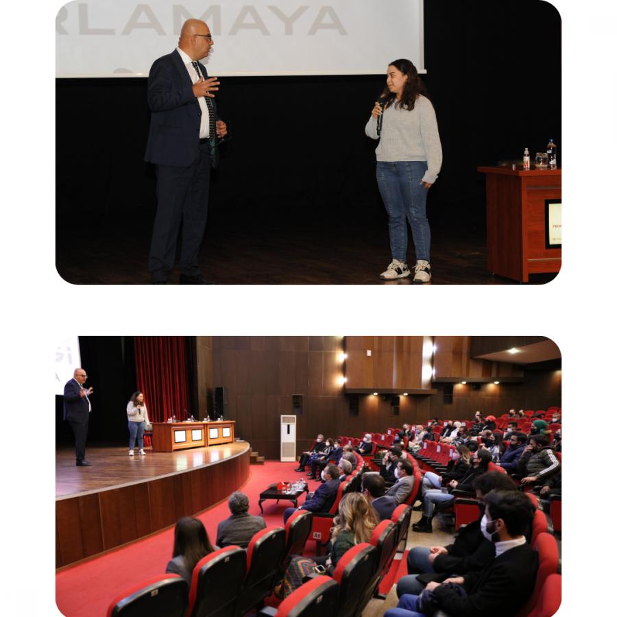 Konuklar etkinliğe katılan öğrencilerden gelen soruları yanıtladıktan sonra etkinlik sonunda da katılımcılara güzel bir sürpriz yaptı. Etkinlik sonunda Eti Maden İşletmeleri Genel Müdürü Serkan KELEŞER bir öğrenciyi sahneye davet ederek, bor ile ilgili bir soru yönetti. Sahneye çıkma cesareti gösteren KTÜ Mühendislik Fakültesi Metalurji ve Malzeme Mühendisliği Bölümü öğrencisi Sinem ERDOĞAN vermiş olduğu cevap ile tüm masrafları Eti Maden tarafından karşılanmak üzere Amerika’da staj ve dil kursu fırsatı kazandı. Yapmış olduğu sürpriz için Serkan Bey ve Eti Maden’e teşekkür, cesareti ve kazandığı ödül için ise öğrencimizi tebrik ediyoruz.