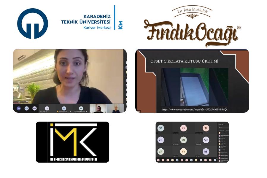 Fındık Ocağı firması ile KTÜ Kariyer Merkezi tarafından düzenlenen “Çikolata Kutusu Tasarım Atölyesi” adlı seminer 28 Şubat 2021 tarihinde online olarak gerçekleştirildi. Seminere Cumhurbaşkanlığı İnsan Kaynakları Ofisi "Yetenek Kapısı" platformu ve KTÜ Kariyer Merkezi internet sitesi üzerinden başvuran 102 kişi kabul edildi. 102 Fındık Ocağı firması kurucusu Seyyare SUNGUR’un sunum yaptığı seminerin moderatörlüğünü İçmimarlık Kulübü Yönetim Kurulu Başkanı Muhammet Ali AKYÜZ yaptı. Seminerde Seyyare SUNGUR’un Trabzon'da yıllardır iç içe olduğu fındıktan vazgeçmeyerek, 3 kız kardeşi ile birlikte fındığı çikolatayla buluşturup kendi markalarını oluşturmalarının serüveni paylaşıldı. KTÜ Peyzaj mimarlığı mezunu olan Seyyare SUNGUR, tasarımın ürünlerine kazandırdığı katma değerin altını çizerek, başlattığı çikolata kutusu tasarım yarışmasının ayrıntılarından bahsetti. Sunum sonrasında soru cevap formatında ilerleyen etkinliğimizde katılımcıların soru ve talepleri cevaplandırıldı.