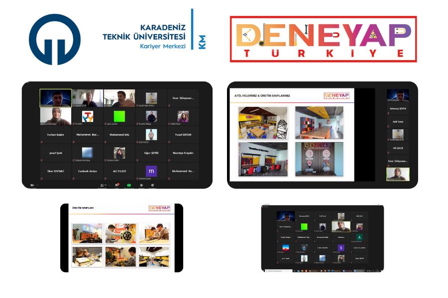 Deneyap Türkiye ile KTÜ Kariyer Merkezi tarafından düzenlenen “Deneyap Türkiye Bilgilendirme” semineri 27 Şubat 2021 tarihinde online olarak gerçekleştirildi. Trabzon Deneyap eğitmeni ve yerel yönetim kurulu üyesi Ali GÖZÜKARA moderatörlüğünde, Deneyap Türkiye Koordinatörü Sümeyye Elif SUBAŞI sunumuyla gerçekleştirilen seminere Türkiye’nin dört bir yanından katılım sağlandı. Seminerde ortaokul başlangıç ve lise başlangıç çağı olmak üzere iki yaş grubunda eğitimleri bulunmakta olan Deneyap Teknoloji Atölyeleri hakkında; 36 aylık eğitim programına dahil olmaya hak kazanan öğrencilerin “Tasarım ve Üretim”, “Robotik ve Kodlama”, “Elektronik Programlama ve Nesnelerin İnterneti”, “İleri Robotik”, “Siber Güvenlik”, “Enerji Teknolojileri”, “Havacılık ve Uzay Teknolojileri”, “Yazılım Teknolojileri ve Mobil Uygulama”, “Nanoteknoloji ve Malzeme Bilimi” ve “Yapay Zeka” olmak üzere 10 farklı alanda ücretsiz teknoloji eğitimleri yapabileceklerinden ve bu sürecin ilk 12 ay, ikinci 12 ay ve son 12 ay olarak toplamda 3 aşamadan oluştuğu konularında bilgilendirme yapıldı.