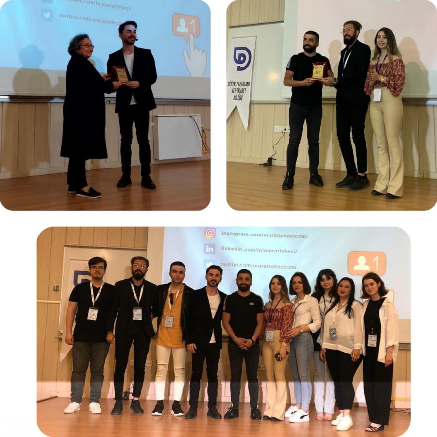 Ayhan KARAMAN “Dijitalde Öne Çıkmak” başlıklı sunumunu yaptı. Sunumda meslek hayatından tecrübelerini aktararak öğrencilere bu yolda uygulanması gereken stratejilerin neler olduğunu anlattı. Ardından Murat TEKECİ “Sosyal Medyanın Gücüyle Kişisel Marka Yaratma” başlıklı sunumunu yaptı. Sunumda kendi markasını oluşturmak isteyen öğrencilerimiz için sosyal medyanın gücünden nasıl faydalanılabileceğini aktardı. Etkinlik Dijital Pazarlama ve E-Ticaret Kulübü Yönetim Kurulu Başkanı ile KM Müdürü Prof. Dr. Hülya KALAYCIOLU’nun konuşmacılarımıza plaket takdimiyle sonlandı.