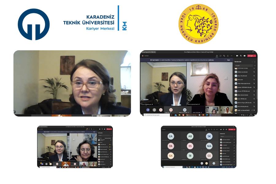 Türk Hukukçu Kadınlar Derneği ile KTÜ Kariyer Merkezi tarafından düzenlenen “İnsan Hakları Bağlamında Kadın Hakları ve Toplumsal Cinsiyet Eşitliği” semineri 08 Mart 2021 tarihinde online olarak gerçekleştirildi. Prof. Dr. Mine GÖZÜBÜYÜK TAMER moderatörlüğünde Türk Hukukçu Kadınlar Derneği Başkanı Av. Süreyya Turan’ın sunum yaptı. Dünya Kadınlar Günü’nün kutlanma nedeninin ve tarihçesinin anlatılması ile başlayan sunum, kadın hakları ve kadın sağlığı konularında bilgilendirmelerle devam etti. Ayrıca seminerde, kadınların fiziksel, sosyal ve ruhsal sağlıklarının iyi olmasının çocukların ve aile bütünlüğünün sağlıklı olması açısından önemi, kadınların hijyen ve aile planlaması, kadın hakları konularında bilgilendirilmeleri ve bu tarz konular ile ilgili başvurabilecekleri kurum ve kuruluşlar hakkında bilgiler verildi.