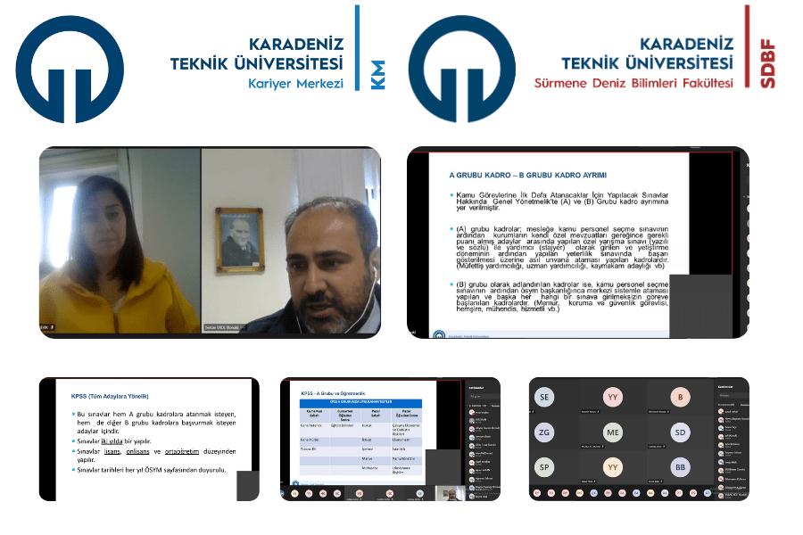 “Kariyer Planlamasında KPSS” semineri Sürmene Deniz Bilimleri Fakültesi ve KTÜ Kariyer Merkezi işbirliğiyle 05 Ocak 2021 tarihinde online olarak gerçekleştirildi. Deniz Ulaştırma İşletme Mühendisliği Bölümü Öğretim Üyesi Doç. Dr. Sercan EROL’un katılımıyla gerçekleştirilen seminerde ÖSYM tarafından kamu kurum ve kuruluşlarında görev alacak personelin belirlenmesi amacıyla yapılan KPSS (Kamu Personeli Seçme Sınavı) hakkında katılımcılar detaylı olarak bilgilendirilerek, A ve B grupları olmak üzere ikiye ayrılan sınavda hangi mezunların hangi gruba gireceği konusuna açıklık getirildi. KPSS puanı nasıl hesaplanır, konu kapsamları nelerdir, kaç yılda bir tekrarlanır, puan çeşitliliği nasıl olur gibi sorular cevaplandı ve tercih işlemleri ile geçiş yapılabilecek bölümler hakkında bilinmesi gereken noktalar aktarıldı.
