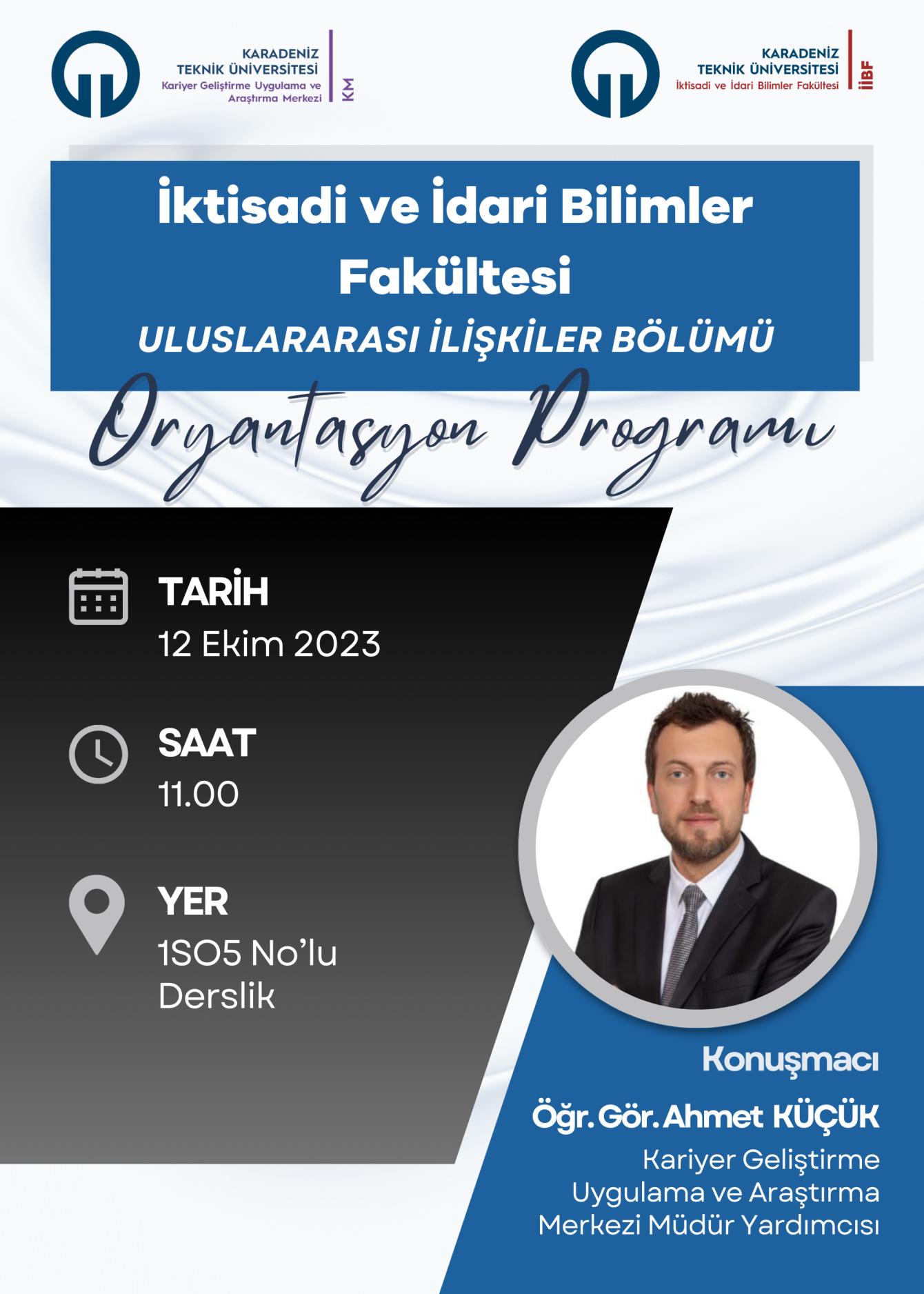 2023-2024 eğitim-öğretim yılında KTÜ İktisadi ve İdari Bilimler Fakültesi Uluslararası İlişkiler Bölümüne yeni kayıt yaptıran öğrencilerimiz için 12.10.2023 tarihinde saat 11:00 da 1SO5 No’lu derslikte oryantasyon programı düzenlendi. Oryantasyon programına Kariyer Geliştirme Uygulama ve Araştırma Merkezi (KM) Müdür Yardımcısı Öğr. Gör. Ahmet KÜÇÜK de katılım sağladı. Oryantasyon Programı’nda KM Müdür Yardımcısı Öğr. Gör. Ahmet KÜÇÜK, KM bünyesinde gerçekleştirilen bireysel danışmanlık hizmeti, özgeçmiş hazırlama ve mülakat simülasyonları eğitimi, kariyer planlama dersi, sosyal sorumluluk projeleri, öğrenci kulüpleri ile kariyer günleri etkinlikleri, firmalarla iş, staj ve teknik gezi görüşmeleri, mezunlarla iletişim, Cumhurbaşkanlığı İnsan Kaynakları Ofisi (CBİKO) koordinatörlüğünde yürütülen Kariyer Fuarları, CBİKO Yetenek Kapısı Platformu’nun kullanımı ve sağladığı faydalar, CBİKO Kariyer Kapısı Platformu ve Ulusal Staj Programı, eğitim, etkinlik, akademik gelişim gibi konular hakkında bilgilendirmelerde bulundu.
