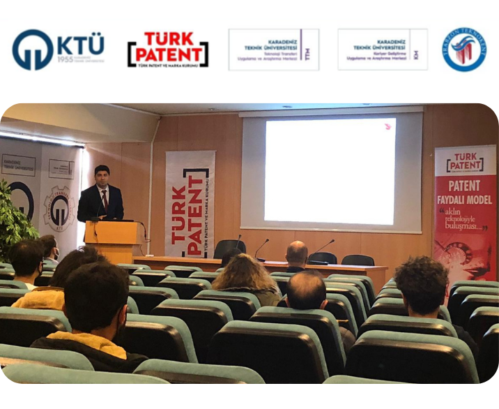 KTÜ Kariyer Geliştirme Uygulama ve Araştırma Merkezi, Teknoloji Transferi Uygulama ve Araştırma Merkezi ve Trabzon Teknokent'in paydaşlığında üniversitemiz ve bölge üniversitelerin araştırmacıları, Trabzon Teknokent Bölgesi'nde yer alan firma temsilcileri ve üniversitemiz öğrencileri için Türk Patent ve Marka Kurumu Uzman Yrd. Volkan BERRAK tarafından;