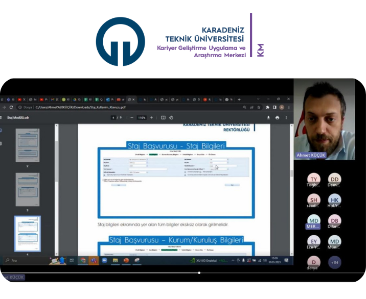Kariyer Geliştirme Uygulama ve Araştırma Merkez (KM) tarafından düzenlenen Ulusal Staj Programları ve Staj Süreçleri etkinliği KM Müdürü Prof. Dr. Hülya KALAYCIOĞLU moderatörlüğünde ve KM Müdür Yrd. Öğr. Gör. Ahmet KÜÇÜK’ ün sunumuyla 30 Mayıs 2023 tarihinde saat: 14:00’da online olarak gerçekleştirildi. Etkinlikte ilk olarak öğrencilerin staj yapabilecekleri kanallardan ve staj türlerinden söz edildi. Etkinliğin devamında Cumhurbaşkanlığı İnsan Kaynakları Ofisi tarafından oluşturulan Kariyer Kapısı Ulusal Staj Platformu ve bu platformda yer alan Ulusal Staj Programı (USP) anlatıldı. Kimlerin, nasıl, ne zaman USP’ ye başvuru yapabileceği, başvuruların nasıl değerlendirildiği ve öğrencilerin firma/kurumlardan teklif alma ve teklifi kabul etme süreçlerine değinildi. Teklif alıp kabul eden öğrencilerin sonrasında hangi işlemleri yapacağı, KTÜ Öğrenci Bilgi Sisteminde hangi adımları takip edeceği ve sigorta işlemlerini nasıl yapacağı katılımcılara aktarıldı. Sunumu gerçekleştiren KM Müdür Yrd. Öğr. Gör. Ahmet KÜÇÜK etkinlik sonunda katılım sağlayan öğrencilerden gelen her bir soruya ve kendisine iletilen sorunlara tek tek cevap vererek ve çözüm yollarını anlatarak yaklaşık 3 saat süren etkinliği sonlandırdı.