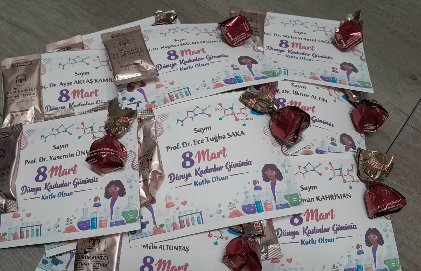 Hazırlanan kartlara küçük ama samimi bir ikram da eşlik etti. Tebrik kartlarının yanında yer alan Türk kahvesi ve çikolata, bu özel günün sıcaklığını ve paylaşım ruhunu yansıttı. Kültürümüzde önemli bir yere sahip olan Türk kahvesinin “kırk yıl hatırı”nı simgeleyen anlamı ile çikolatanın ağızda bıraktığı tatlılık, kadınlar gününün anlamına yakışan zarif bir jest olarak karşılık buldu.