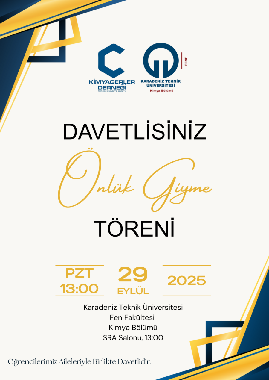 Kimyagerler Derneği Karadeniz Şubesinin Katkılarıyla Yeni Kayıt Yaptıran 1. Sınıf Öğrencilerimiz İçin Düzenlenecek Olan Önlük Giyme Töreni 29.09.2025 Pazartesi Günü Saat 13:00'da Fen Fakültesi Kimya Bölümü SRA Amfisinde Gerçekleştirilecektir.
