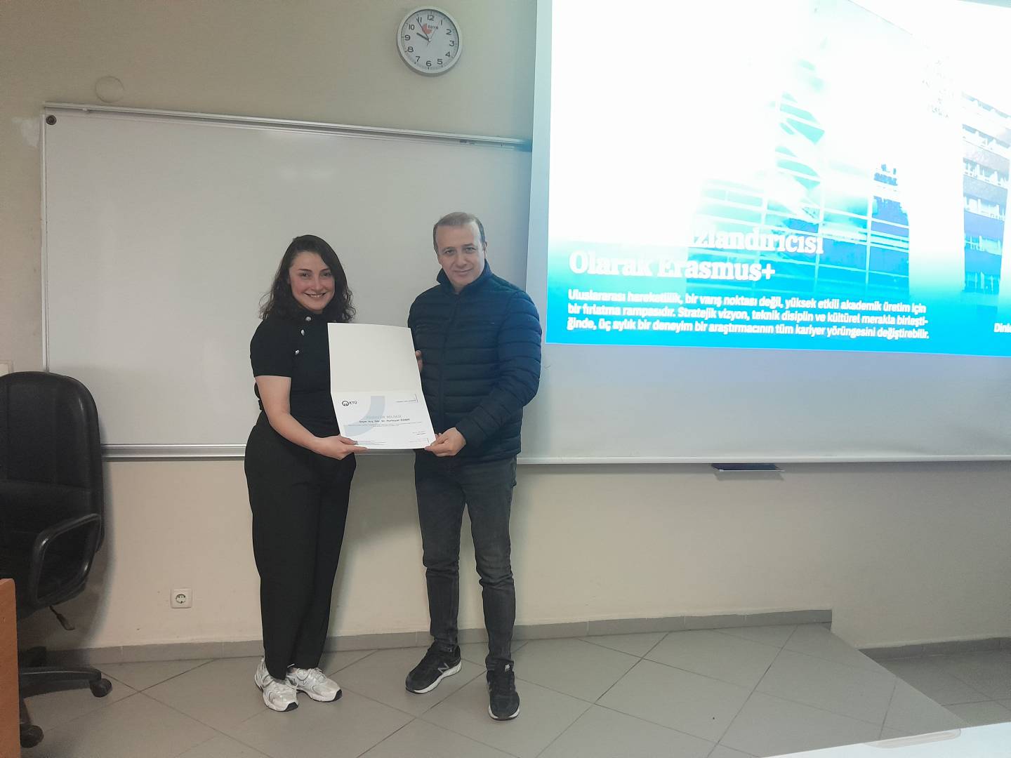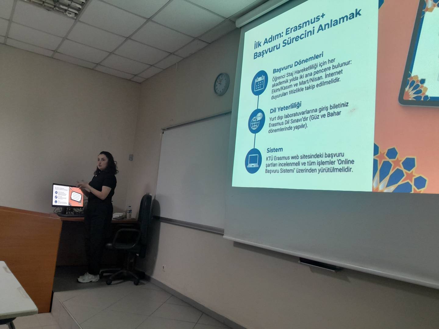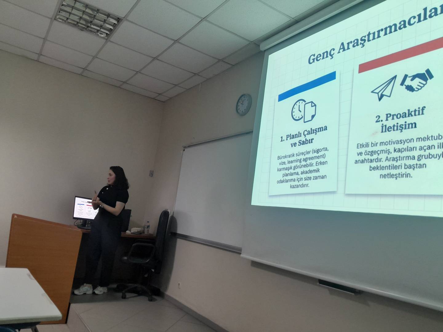 Sunumunda başvuru sürecine ayrıntılı şekilde değinen Özbek, Erasmus+ programına nasıl hazırlandığını, başvuru aşamasında dikkat edilmesi gereken noktaları ve kabul alma sürecini adım adım anlattı. Ayrıca, ev sahibi üniversite ile kurduğu iletişim süreci hakkında da bilgi vererek, doğru ve etkili yazışmanın önemine dikkat çekti.