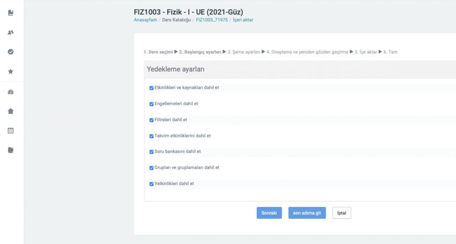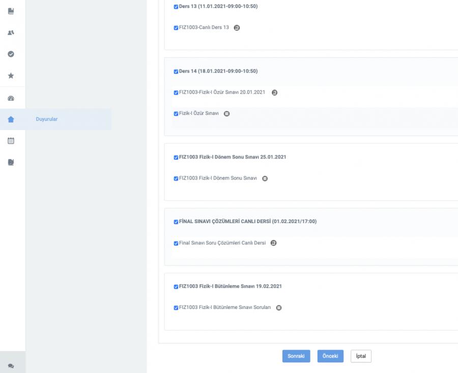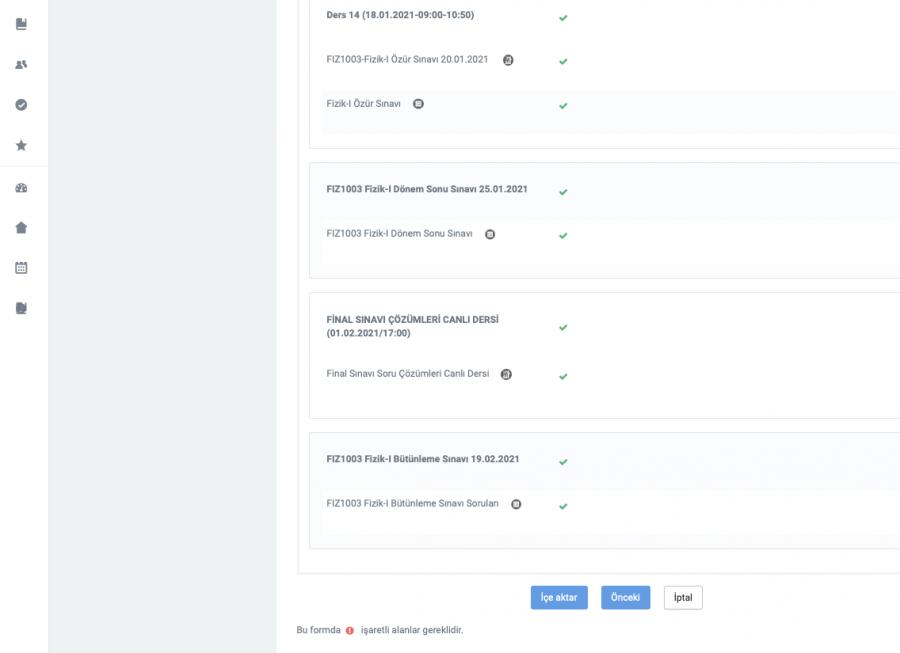 5) Bu aşamada aktarılmak istenen ders konu başlıkları ve canlı ders kayıt linkleri seçilir. İstenildiği takdirde sınavlara ait kutucuklardaki tikler kaldırılarak yeni derse aktarılmayabilir. Ardından "Sonraki" butonuna tıklanır.