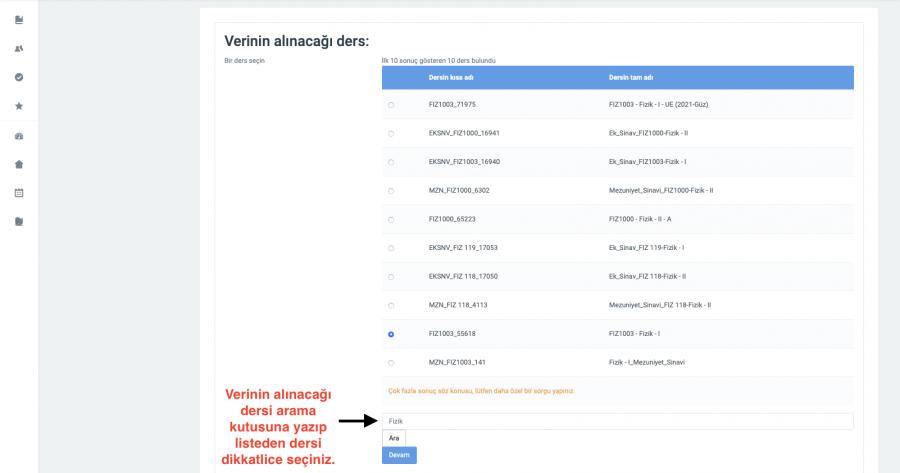3) Verinin alınacağı dersi arama kutusuna yazarak "ARA" butonuna tıklayınız ve üstte listelenen derslerden "Verinin Alınacağı Dersi" seçiniz. (Verinin alınacağı ders ile aktarılacak ders kodları aynı olmalıdır. Listelenen derslerden mezuniyet sınavı, ek sınav gibi seçenekler SEÇİLMEMELİDİR!). Ardından "Devam" botunona tıklayınız.