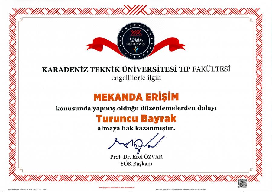 Yükseköğretim Kurulu (YÖK) tarafından üniversitelerde engelsiz bir ekosistemin oluşturulmasını teşvik etmek amacıyla gerçekleştirilen 2022 Yılı Engelsiz Üniversiteler Ödülleri açıklandı. Fakültemiz, engelliler için tüm mekânlarının erişilebilir olduğunu Turuncu Bayrak Ödülünü kazanarak tescilledi.