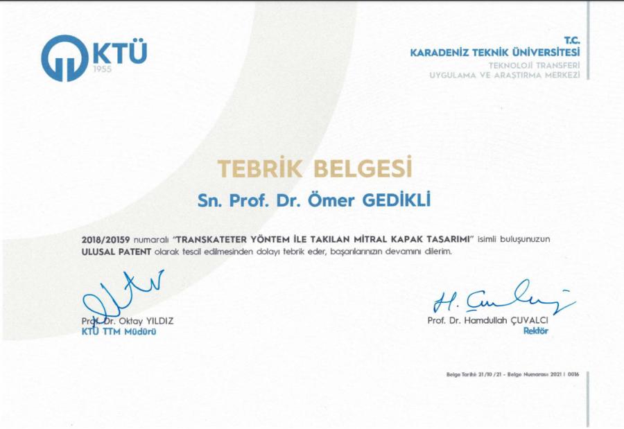 Fakültemiz Kardiyoloji Anabilim Dalı öğretim üyelerinden Prof. Dr. Ömer GEDİKLİ'nin, 2018/20159 numaralı "Transkatater Yöntem İle Takılan Mitral Kapak Tasarımı" isimli buluşu, Ulusal Patent olarak tescil edilmiştir. Öğretim üyemizi tebrik eder bundan sonraki çalışmalarında başarılar dileriz.