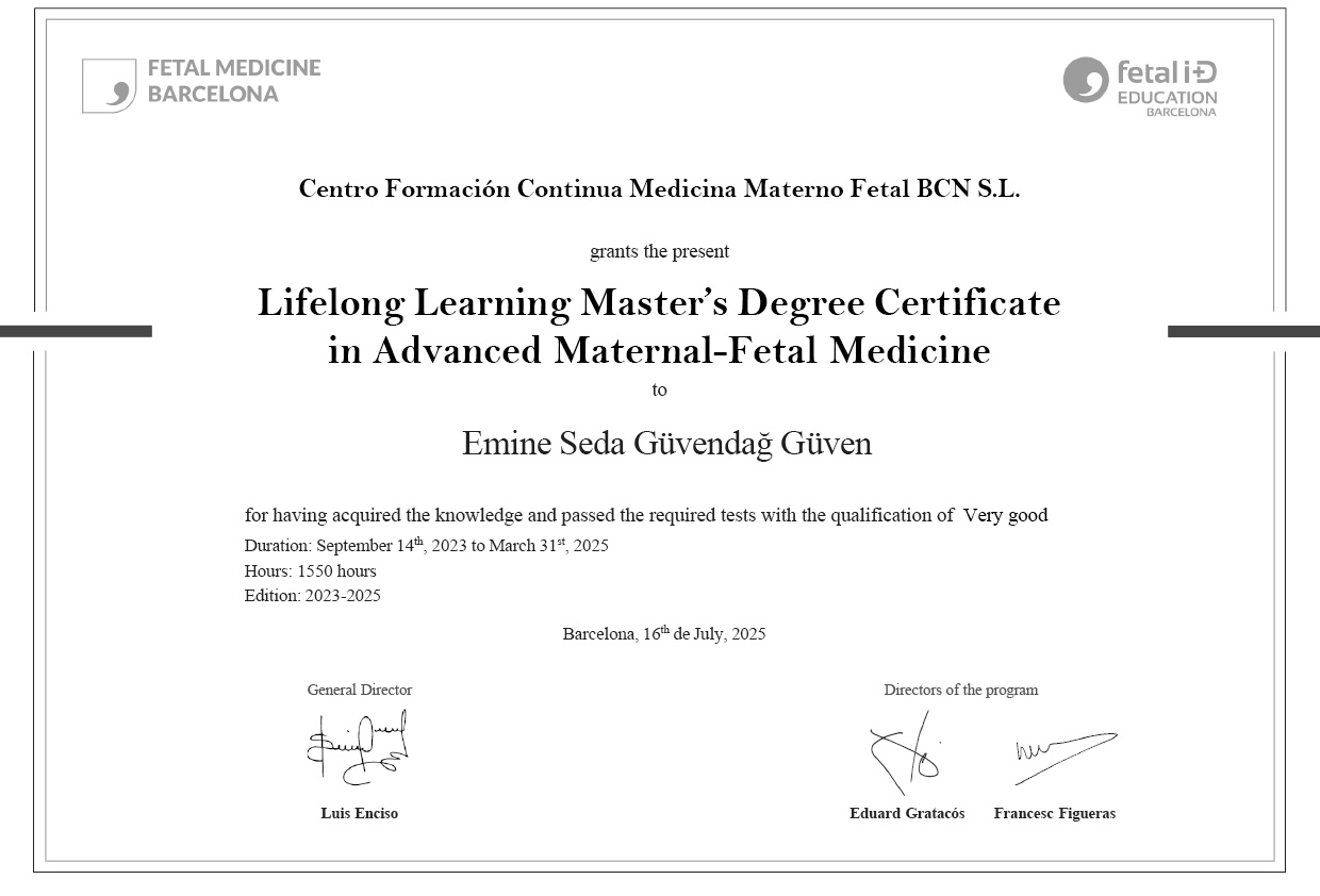 Prof. Dr. Emine Seda GÜVENDAĞ GÜVEN, İleri Düzey Maternal Fetal Tıp (Perinatoloji) Master Derecesi Sertifikasını Almaya Hak Kazandı