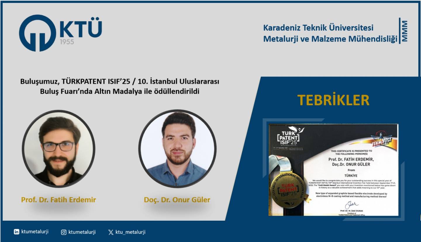 Bölümümüz akademisyenlerinden Prof. Dr. Fatih ERDEMİR ve Doç. Dr. Onur GÜLER, geliştirdikleri buluş ile uluslararası alanda önemli bir başarıya imza attı. 17-21 Eylül 2025 tarihleri arasında İstanbul’da düzenlenen TÜRKPATENT ISIF’25 / 10. İstanbul Uluslararası Buluş Fuarı’nda, “Yeni Tip Genişletilmiş Grafit Bazlı Esnek Elektrot,Elektrolitsiz Ni-B Kaplama Yöntemi ve Buna Ait Üretim Yöntemi” başlıklı çalışmalarıyla Altın Madalya Ödülü’ne layık görüldüler. Akademisyenlerimizin bu başarısı, bölümümüzün araştırma-geliştirme kapasitesini ve yenilikçi vizyonunu bir kez daha ortaya koyarken, aynı zamanda ülkemizin bilimsel alandaki uluslararası görünürlüğüne de katkı sağlamıştır. Metalurji ve Malzeme Mühendisliği Bölüm Başkanlığı olarak, hocalarımıza bölümüze olan katkılarından dolayı içtenlikle teşekkür ediyor, başarılarının devamını diliyoruz.
