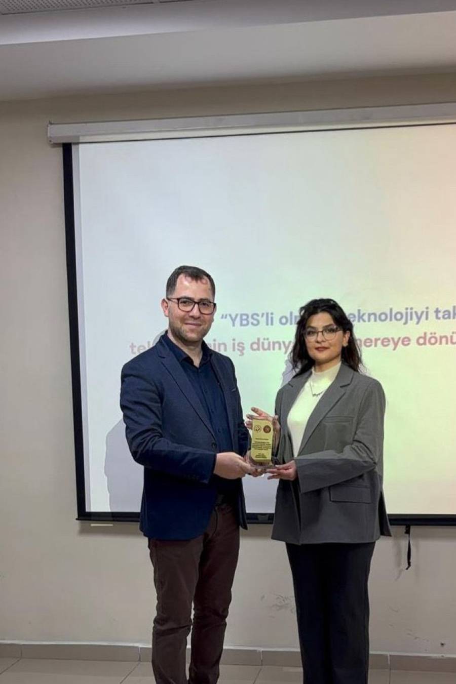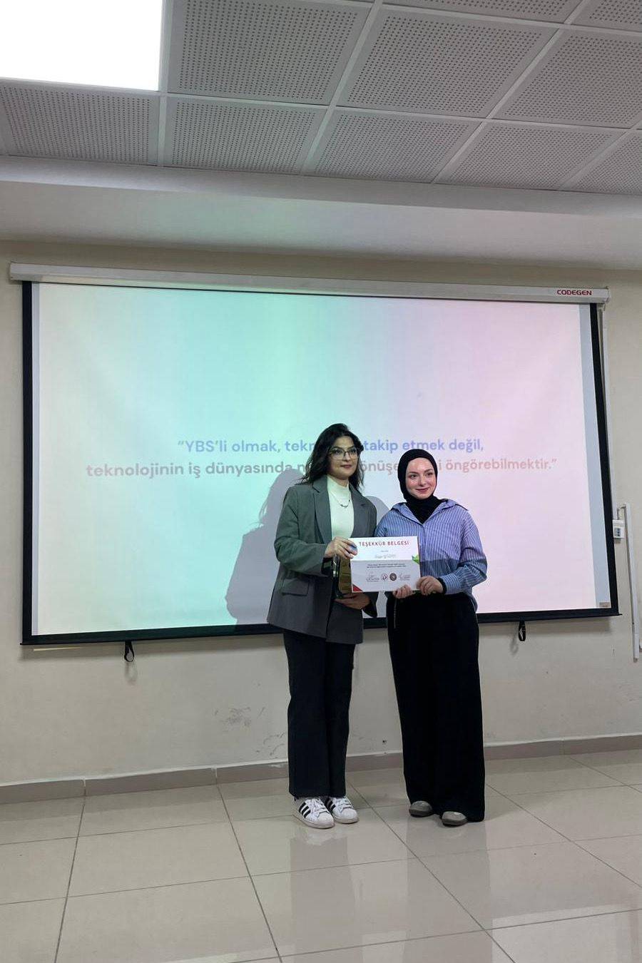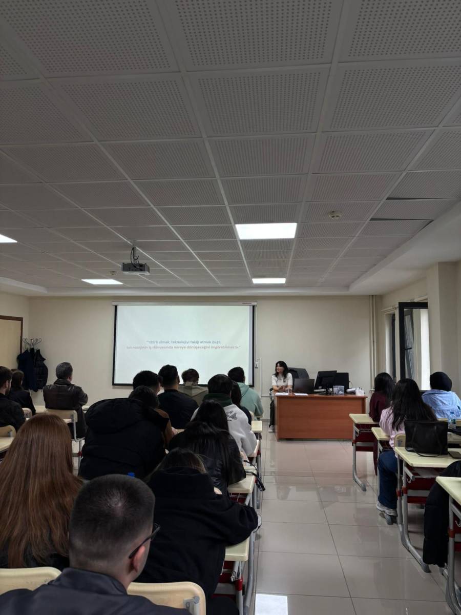 A seminar organized by the Management Information Systems Department of Trabzon University was held with high student participation. Research Assistant Beyza GÜDEK, who participated as a speaker, provided a general overview of the development of the MIS field from the past to the present, its current place in the business world, and its future direction.