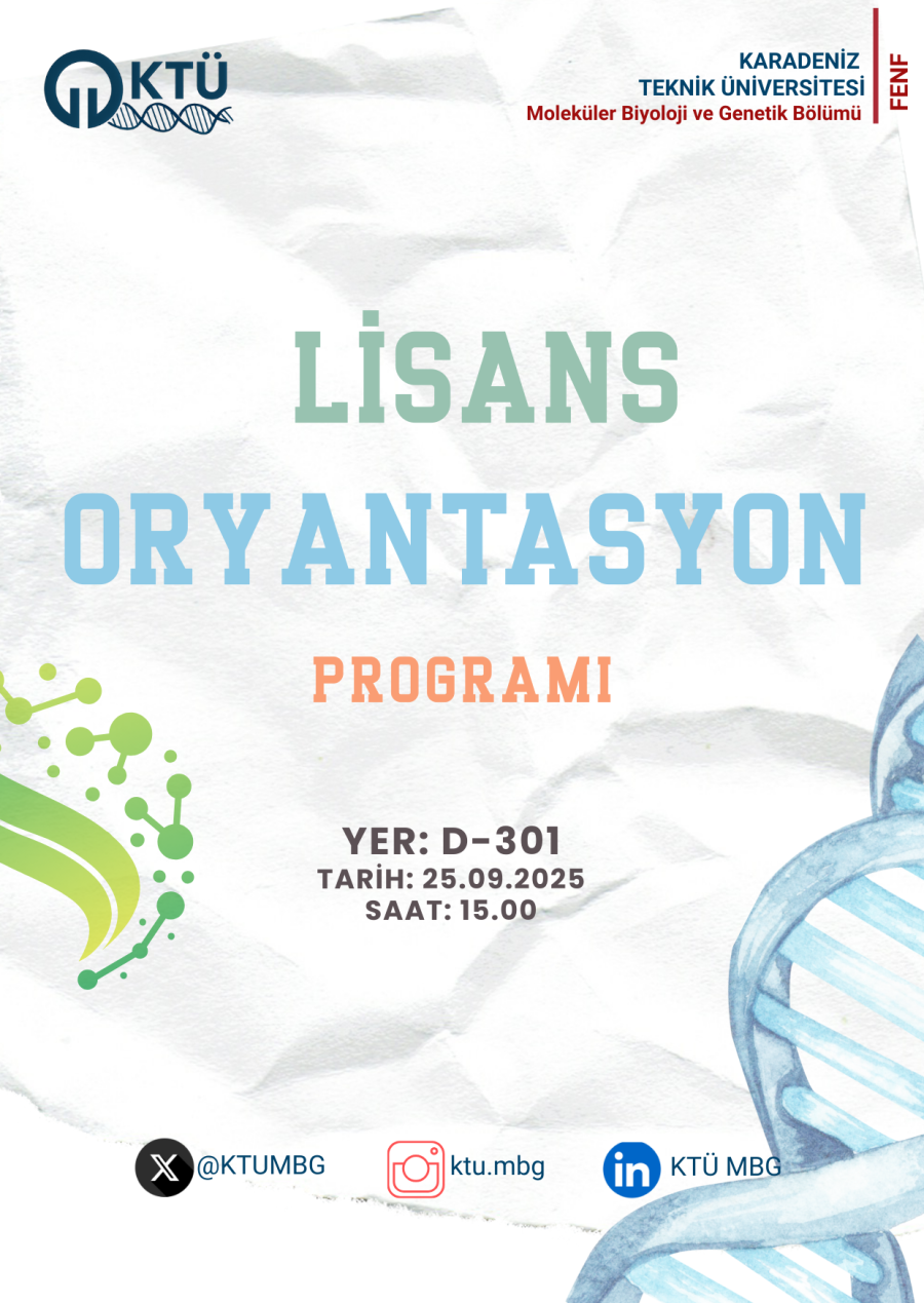 Bölümümüz tarafından 25 Eylül 2025 Perşembe günü saat 15.00’te lisans oryantasyon ve bilgilendirme toplantısı düzenlenecektir.