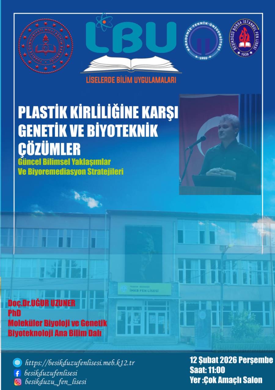 12 Şubat Perşembe günü Beşikdüzü İstanbul Borsa Fen Lisesi’nde “Plastik Kirliliğine Karşı Genetik ve Biyoteknik Çözümler: Güncel Bilimsel Yaklaşımlar ve Biyoremediasyon Stratejileri” başlıklı bir sunum gerçekleştirildi.