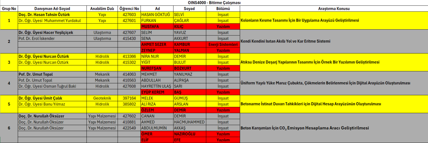 OINS4009 Bitirme Çalışması İçerisinde Yer Alan Çok Disiplinli Mühendislik Uygulamaları Kapsamında Çalışma Grupları İlan Edilmiştir