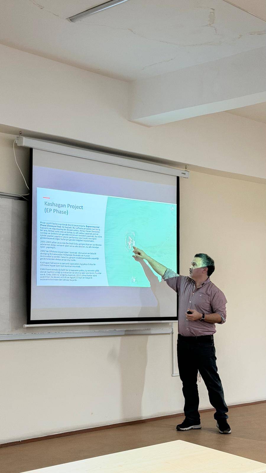 Karayolu Proje dersine davetli olarak katılan İnşaat Mühendisi Mehmet Talat KARADENİZ Business Manager / Project Controls Manager olarak yer aldığı Kashagan Yapay Adalar projesi ile ilgili bir sunum gerçekleştirmiştir. Sunumda proje ile ilgili genel bilgi, projenin saha imalatları, firma organizasyon yapısı ve kontrol takımı hakkında önemli bilgiler aktarılmıştır.