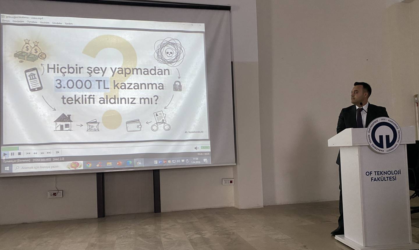 Üniversitemiz ile Trabzon Cumhuriyet Başsavcılığı tarafından organize edilen eğitim fakültemiz konferans salonunda yapıldı. Of Cumhuriyet Savcısı Yusuf Ozan Korkmaz tarafından verilen eğitimde; öğrencilerin ıban dolandırıcığı hakkında duyarlı olmaları vurgusu yapıldı. Banka hesabını temiz duygularla kullandırılarak art niyetli kişilerin suç ortağı haline gelmemeleri uyarısı yapıldı. Eğitim sonunda öğrencilerin sorularını Savcı Korkmaz cevapladı.