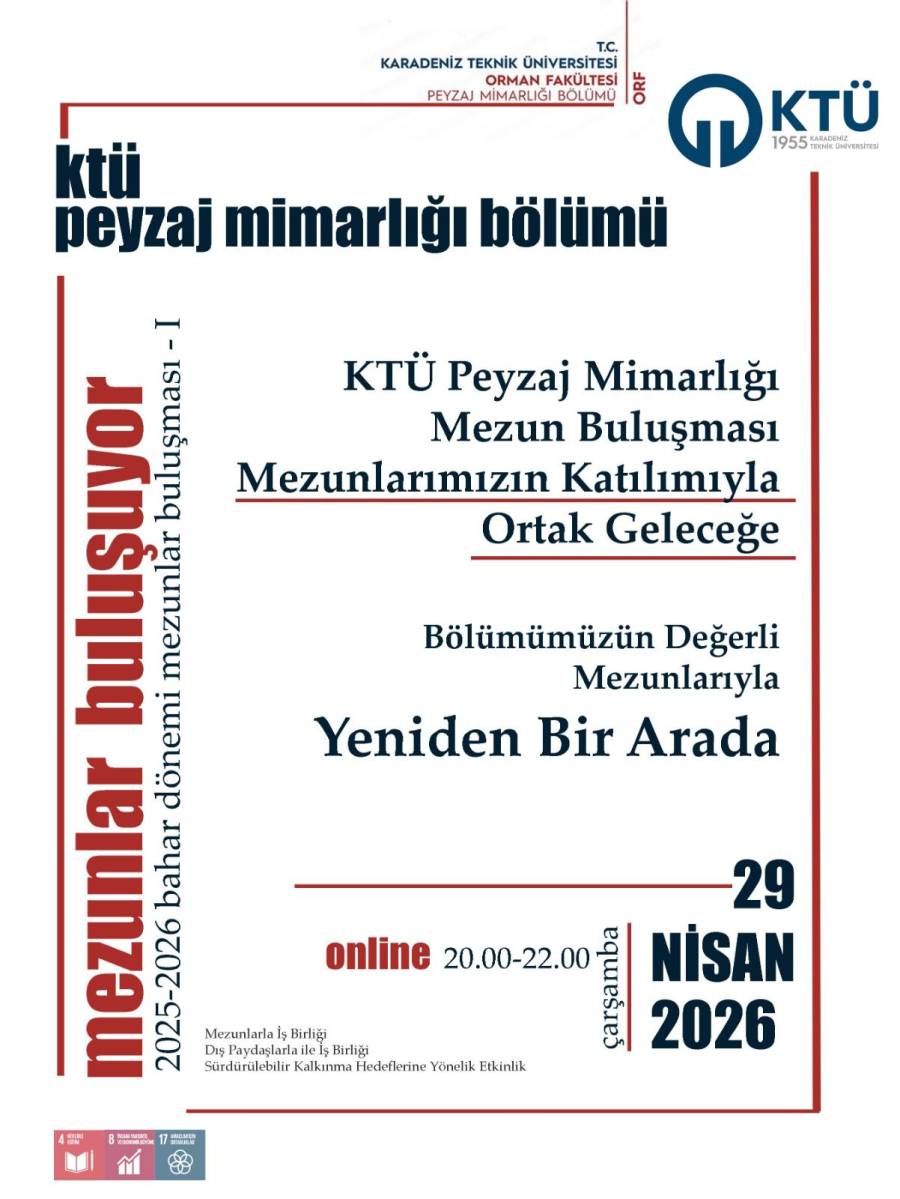 Karadeniz Teknik Üniversitesi Orman Fakültesi Peyzaj Mimarlığı Bölümü olarak düzenleyeceğimiz Mezunlar Buluşması etkinliğinde sizleri aramızda görmekten büyük mutluluk duyacağız.