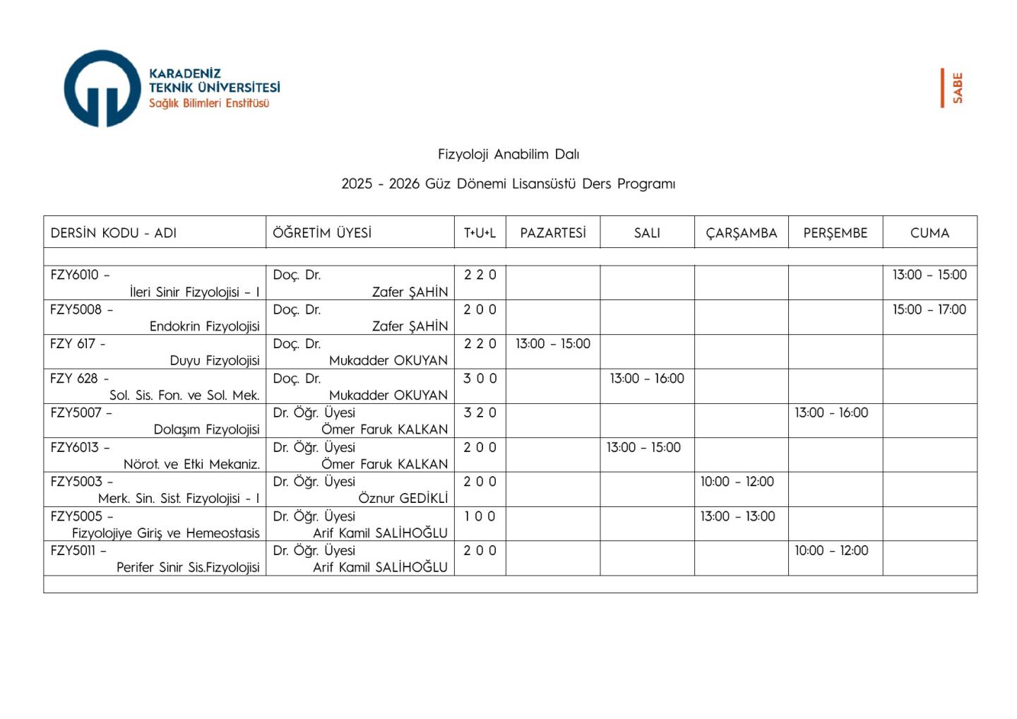 2025 - 2026 Eğitim Öğretim Yılı Güz Dönemi Lisansüstü Ders Programı