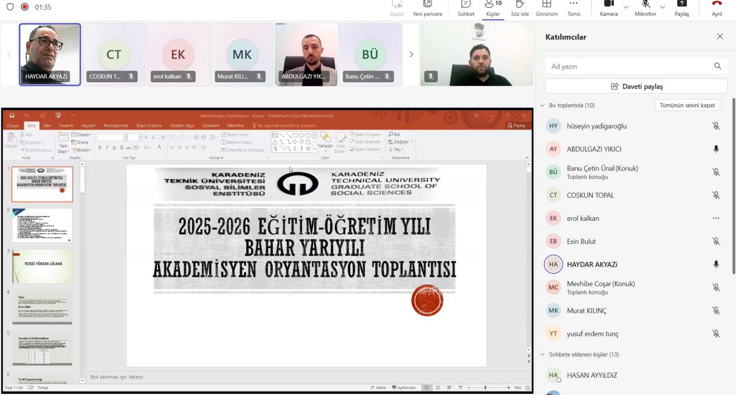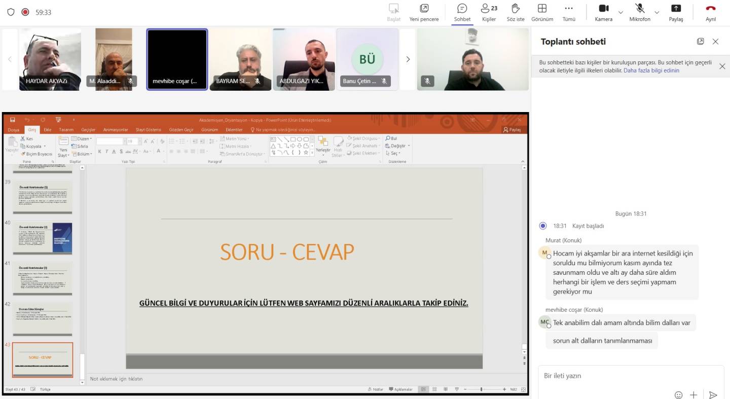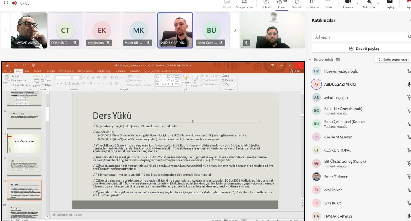 2025-2026 Eğitim-Öğretim Yılı Bahar Yarılında akademisyenlerimize yönelik düzenlenen oryantasyon programında katılımcılara; tez teslim süreçleri, lisansüstü mevzuatı, öğrenci işleri, öğrenci değişim programları hakkında bilgiler verilmiş, ardından akademisyenlerimizden gelen sorular cevaplandırılmıştır.