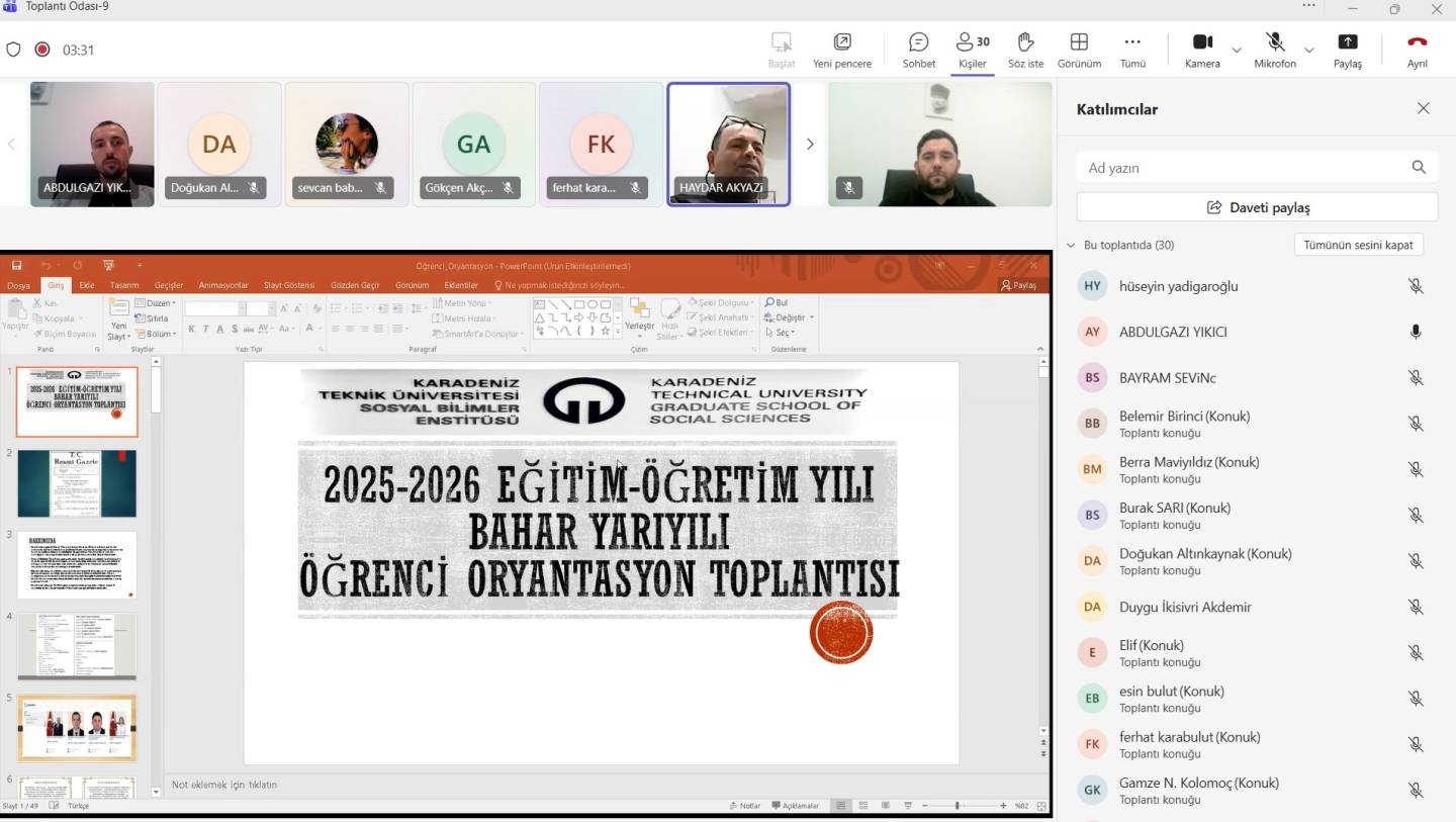 2025-2026 Eğitim-Öğretim Yılı Bahar Yarılında aramıza yeni katılan öğrencilerimiz başta olmak üzere tüm öğrencilerimize yönelik düzenlenen oryantasyon programında katılımcılara; tez teslim süreçleri, lisansüstü mevzuatı, öğrenci işleri, öğrenci değişim programları hakkında bilgiler verilmiş, ardından öğrencilerden gelen sorular cevaplandırılmıştır.