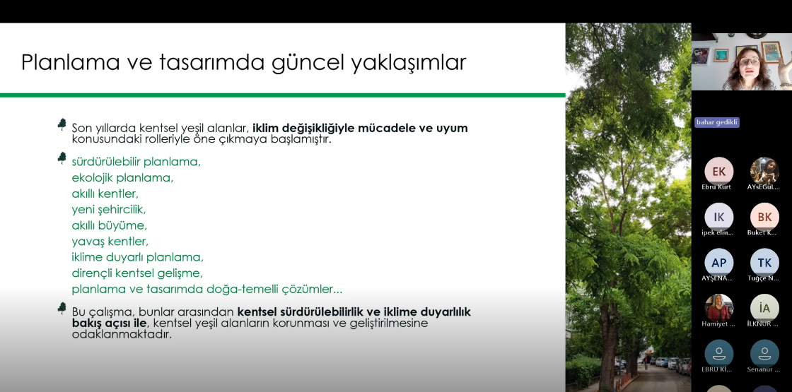 Bölümümüz tarafından düzenlenen “İklime Duyarlı Kentler için Planlama ve Tasarımda Yeşil Altyapının Rolü” başlıklı seminer, 10 Aralık 2025 tarihinde çevrim içi olarak gerçekleştirildi.
