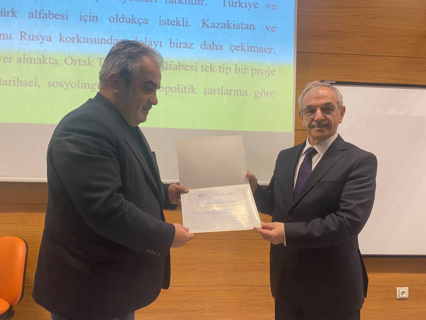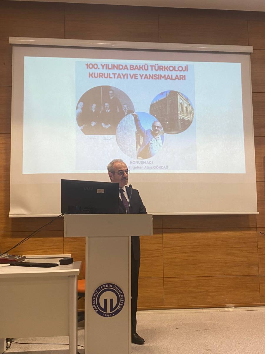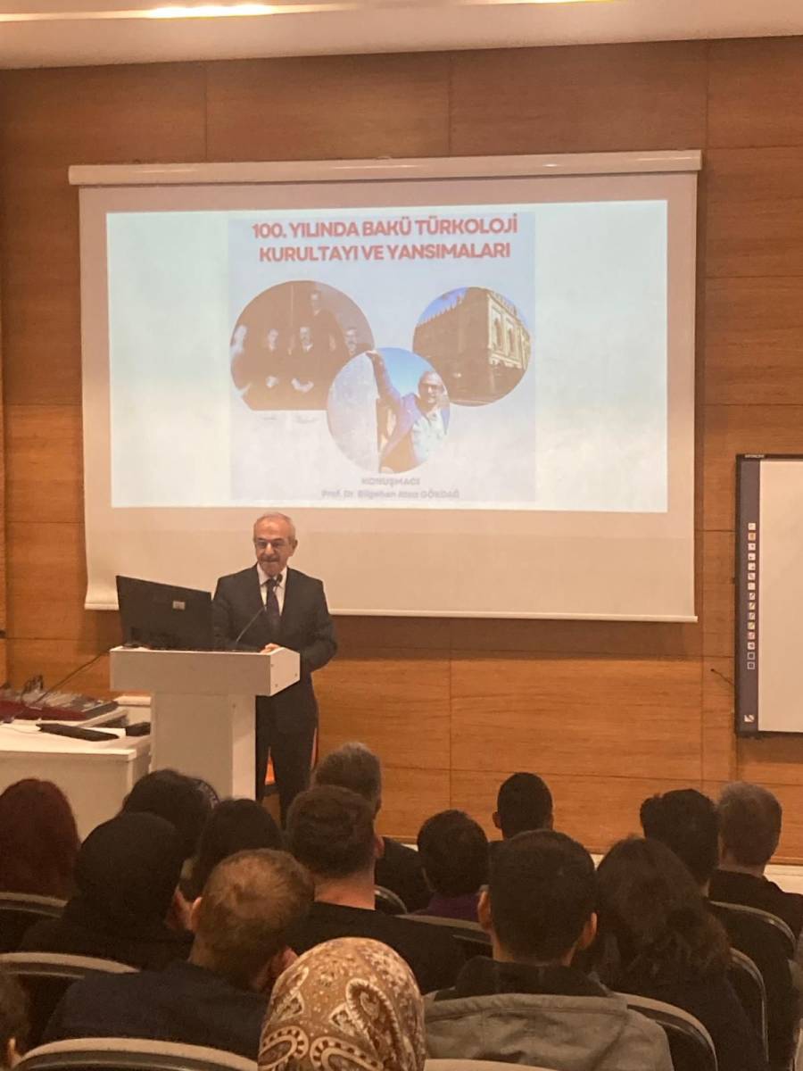 Prof. Dr. Bilgehan Atsız Gökdağ’ın konuşmacı olarak katıldığı “100. Yılında Bakü Türkoloji Kurultayı ve Yansımaları” başlıklı etkinlik, 22 Nisan 2026 tarihinde saat 14.00’te Hikmet Öksüz Konferans Salonu’nda gerçekleştirildi.
