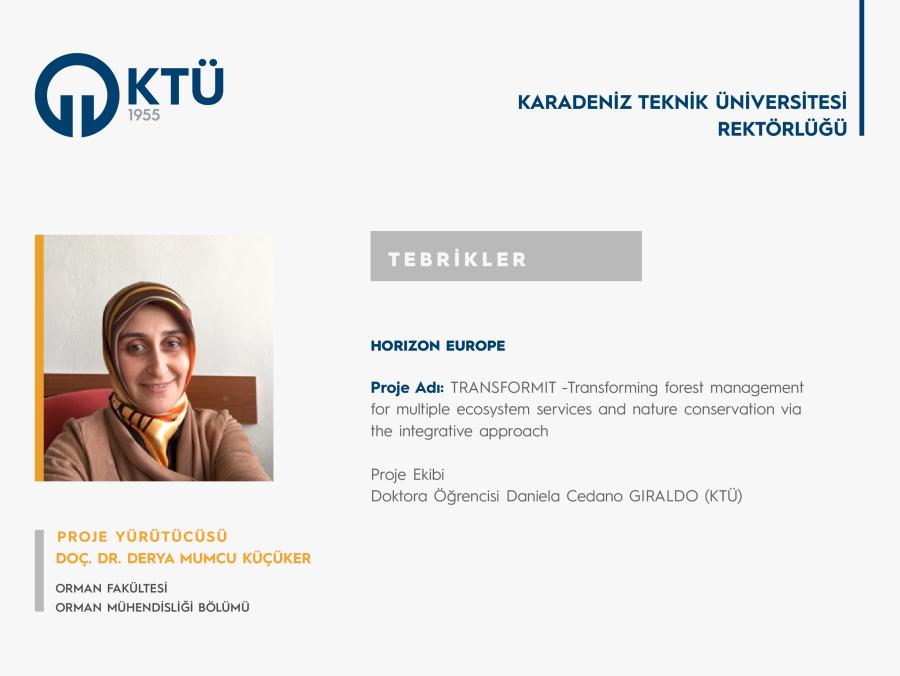 Avrupa Orman Enstitüsü (EFI) koordinatörlüğünde; ”Almanya’dan “UFR”, Hırvatistan’dan “CFRI”, Avusturya’dan “BOKU”, Finlandiya’dan “LUKE” ve “NLS FGI”, Hollanda’dan “WU” ve “WR”, İsveç’ten “SLU”, İspanya’dan “CPF”, Çek Cumhuriyeti’nden “CZU”, Fransa’dan “IEFC”, Slovenya’dan “SFI”, İsviçre’den “ETH” ve “WSL” ve ülkemizden “KTÜ” kurumlarının ortaklıklarıyla 16 kurumdan oluşan konsorsiyumunun sunduğu TRANSFORMIT projesinin toplam bütçesi 6.931.666,25 Euro, süresi 48 ay, amacı ise mevcut pratik ve bilimsel bilgileri entegre ederek verimli ormancılık ve biyolojik çeşitliliğin korunmasını gerçekleştirecek bütünleştirici orman amenajman planlarını hazırlamak, bu amaçla bilim, politika ve uygulama arasında iş birliği sağlamak ve karşılıklı öğrenmeyi gerçekleştirmektir.