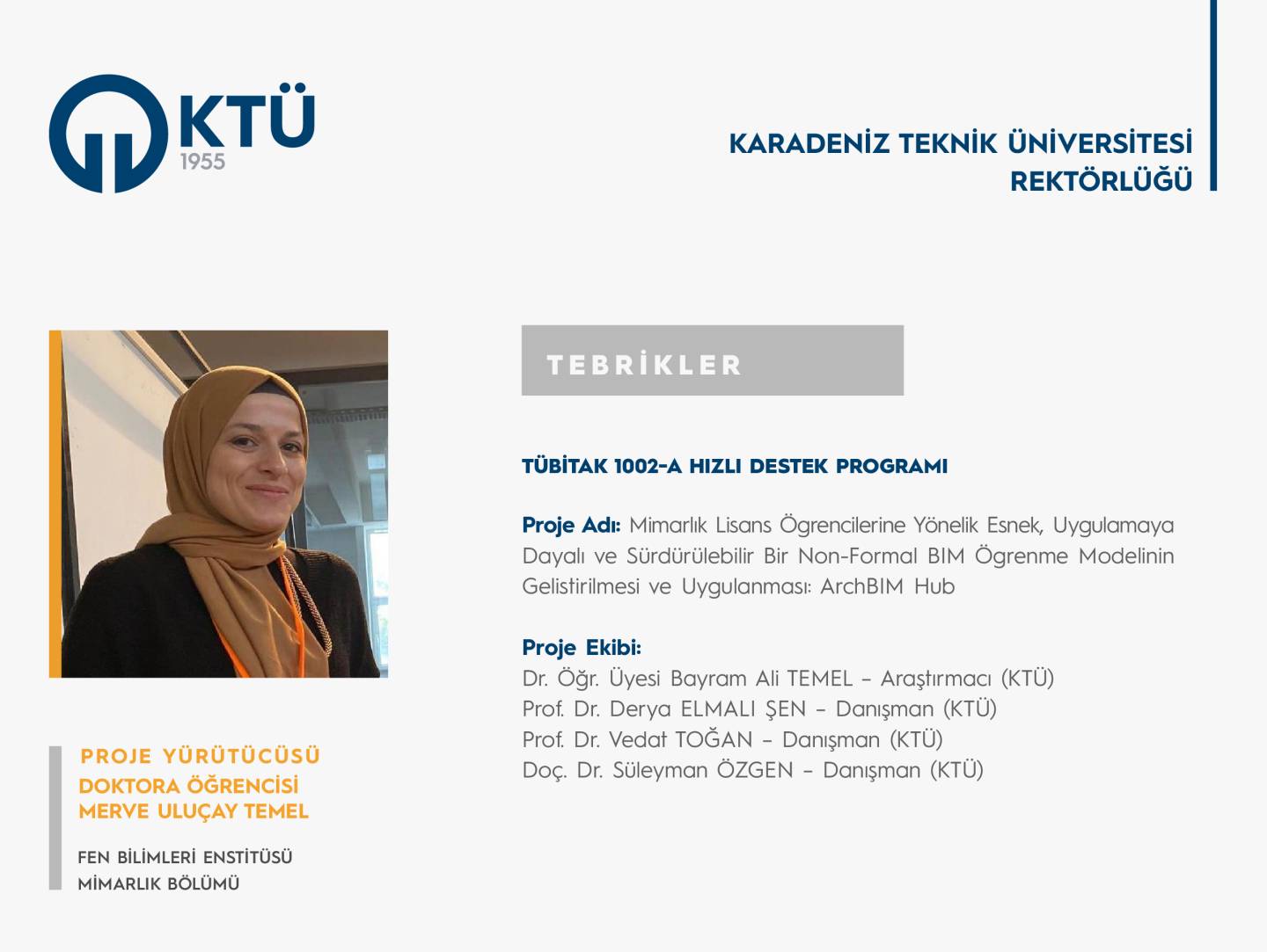 Üniversitemiz Fen Bilimleri Enstitüsü Mimarlık Bölümü'nden Doktora Öğrencisi Merve ULUÇAY TEMEL’in, Üniversitemizde yürütülecek olan "Mimarlık Lisans Ögrencilerine Yönelik Esnek, Uygulamaya Dayalı ve Sürdürülebilir Bir Non-Formal BIM Ögrenme Modelinin Gelistirilmesi ve Uygulanması: ArchBIM Hub” başlıklı projesi, “TÜBİTAK 1002-A Hızlı Destek Programı” kapsamında desteklendi.