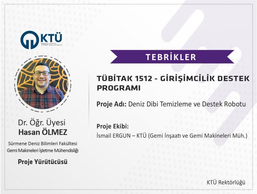 Üniversitemiz Sürmene Deniz Bilimleri Fakültesi Gemi Makineleri İşletme Mühendisliği Bölümü Öğretim Üyesi Dr. Öğr. Üyesi Hasan ÖLMEZ’in, “Deniz Dibi Temizleme ve Destek Robotu” başlıklı projesi, TÜBİTAK 1512 Girişimcilik Destek Programı (BİGG) kapsamında desteklendi.