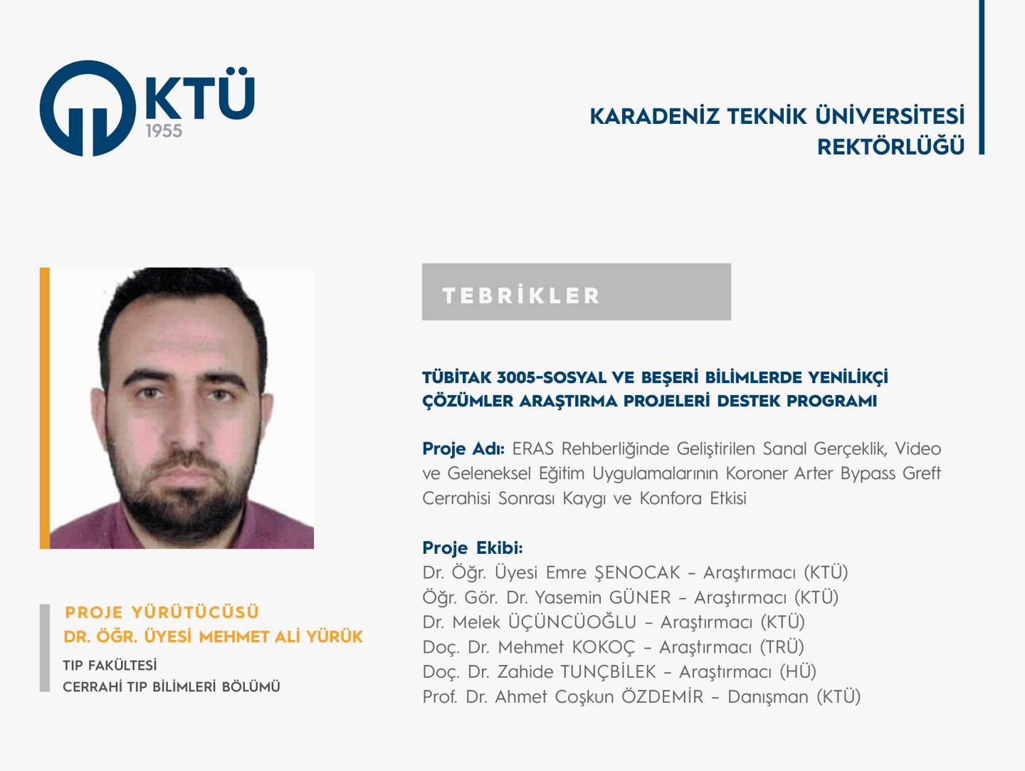 Üniversitemiz Tıp Fakültesi Cerrahi Tıp Bilimleri Bölümü Öğretim Üyelerinden Dr. Öğr. Üyesi Mehmet Ali YÜRÜK’ün "ERAS Rehberliğinde Geliştirilen Sanal Gerçeklik, Video ve Geleneksel Eğitim Uygulamalarının Koroner Arter Bypass Greft Cerrahisi Sonrası Kaygı ve Konfora Etkisi” başlıklı projesi, “TÜBİTAK 3005 – Sosyal ve Beşeri Bilimlerde Yenilikçi Çözümler Araştırma Projeleri Destek Programı” kapsamında desteklenmiştir.