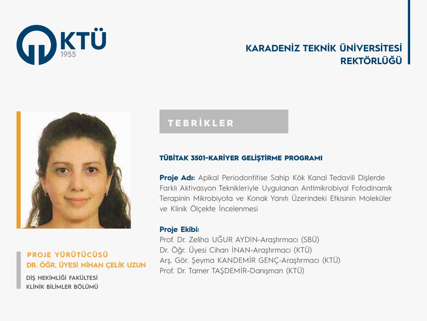 Üniversitemiz Diş Hekimliği Fakültesi Klinik Bilimler Bölümü’nden Dr. Öğr. Üyesi Nihan ÇELİK UZUN’un “Apikal Periodontitise Sahip Kök Kanal Tedavili Dişlerde Farklı Aktivasyon Teknikleriyle Uygulanan Antimikrobiyal Fotodinamik Terapinin Mikrobiyota ve Konak Yanıtı Üzerindeki Etkisinin Moleküler ve Klinik Ölçekte İncelenmesi” başlıklı projesi, “TÜBİTAK 3501-Kariyer Geliştirme Programı” kapsamında desteklenmiştir.