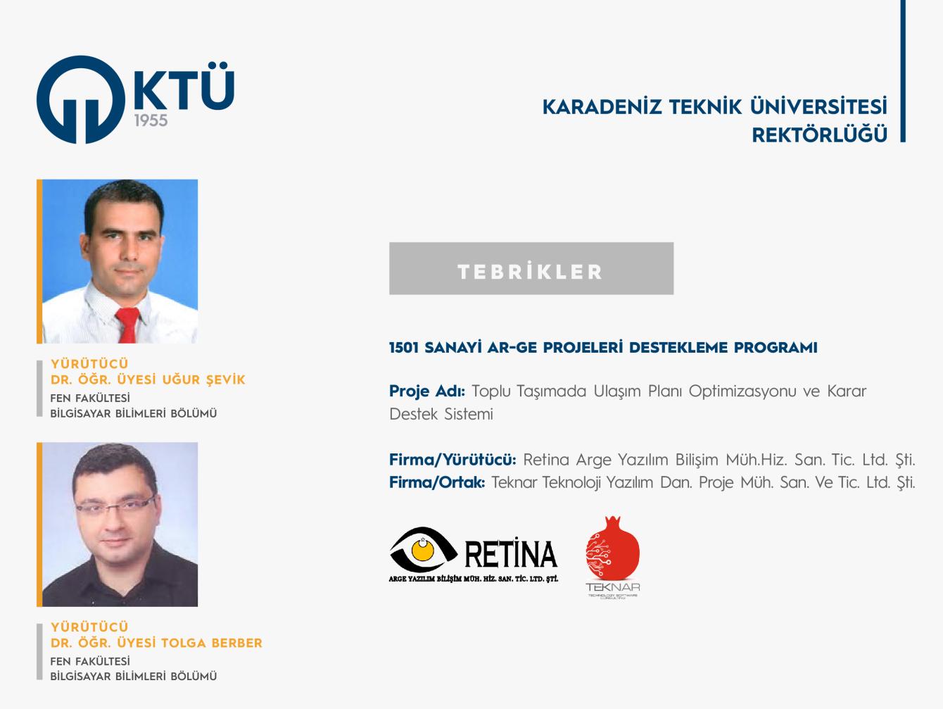 Üniversitemiz Fen Fakültesi Bilgisayar Bilimleri Bölümü akademisyenlerinden Dr. Öğr. Üyesi Uğur ŞEVİK ve Dr. Öğr. Üyesi Tolga BERBER’in kurucu ortağı olduğu Trabzon Teknokent bünyesinde yer alan Retina Arge Yazılım Bilişim Müh. Hiz. San. Tic. Ltd. Şti. firmasının TÜBİTAK 1501 Sanayi Ar-Ge Projeleri Destekleme Programı 2023 yılı 1. Çağrısı kapsamında yaptığı proje başvurusu Teknar Teknoloji Yazılım Dan. Proje Müh. San. Ve Tic. Ltd. Şti. firması ortaklığında desteklenmeye hak kazanmıştır. “Toplu Taşımada Ulaşım Planı Optimizasyonu ve Karar Destek Sistemi” başlıklı proje kapsamında başta belediyeler olmak üzere toplu taşıma hizmetlerinde sefer düzenleme, araç ve personel planlama süreçlerinin otomatik yapılacağı bir karar destek sistemi geliştirilmesi hedeflenmektedir.