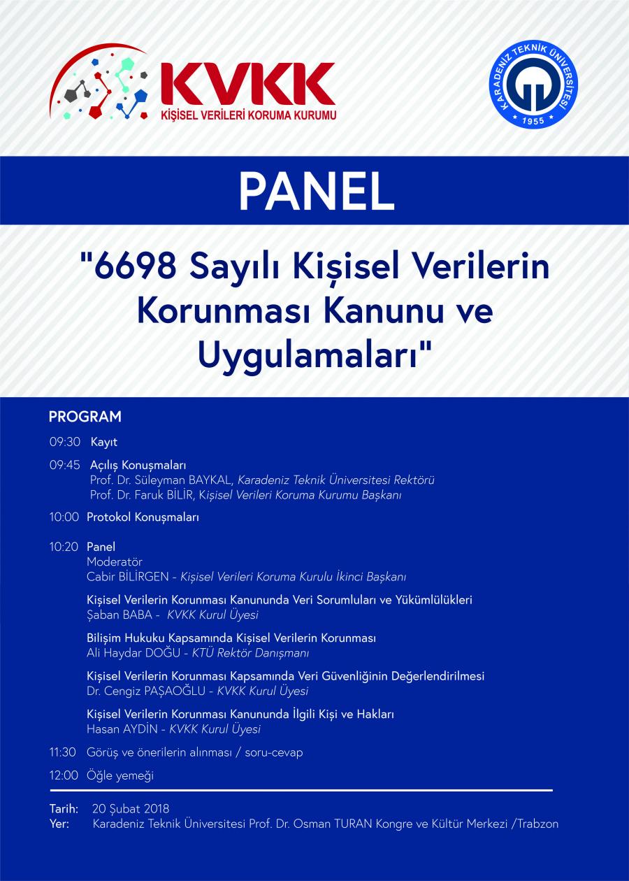 Kanunun üniversiteler, yerel yönetimler, kamu kurum ve kuruluşları ve özel sektörde faaliyet gösteren işletmelere getirmiş olduğu yükümlülükler Karadeniz Teknik Üniversitesi ile Kişisel Verileri Koruma Kurumu (Ankara) iş birliğinde düzenlenen panelde ele alınacaktır.