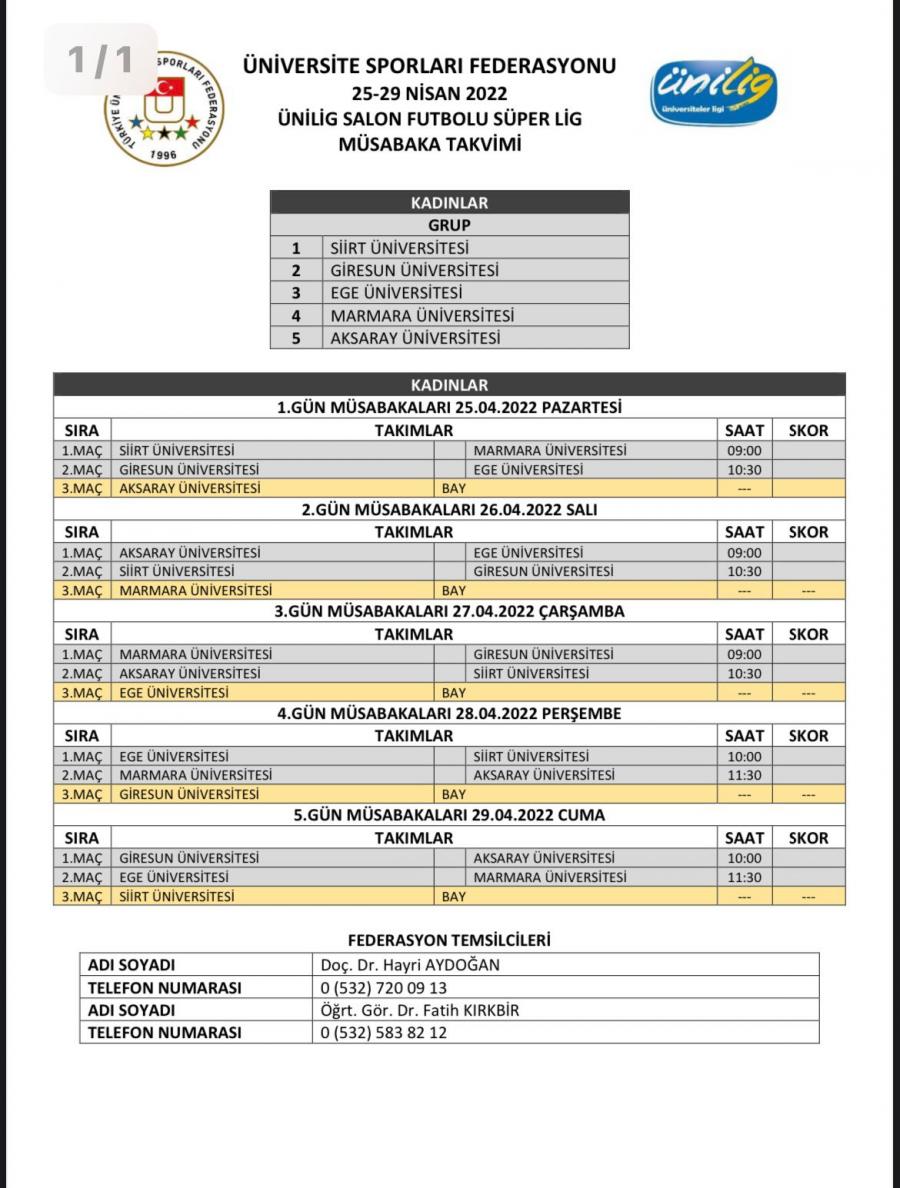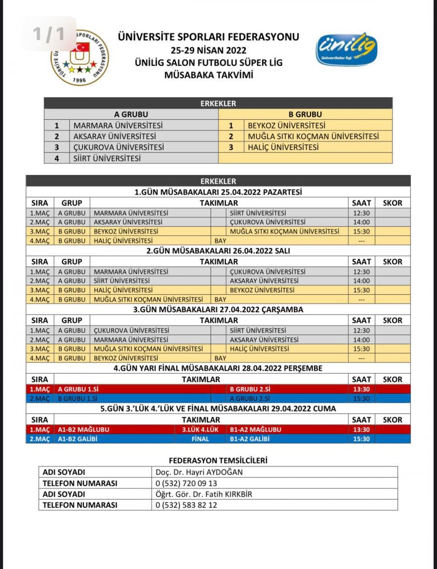 Türkiye Üniversite Sporları Federasyonu tarafından Şehit Eren BÜLBÜL adına düzenlenen Erkekler/Kadınlar Ünilig Salon Futbolu Süperlig Final Müsabakaları, 25-29 Nisan 2022 tarihleri arasında, Hasan Polat Beden Eğitimi ve Spor Merkezi’nde gerçekleştirilecektir.