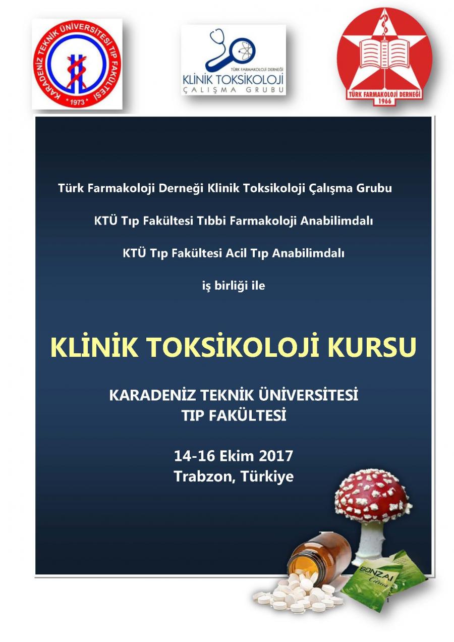 Karadeniz Teknik Üniversitesi Tıp Fakültesi Tıbbi Farmakoloji ve Acil Tıp Anabilim Dalları ile Türk Farmakoloji Derneği Klinik Toksikoloji Çalışma Grubu Yürütme Kurulu üyeleri ve Dokuz Eylül Üniversitesi Tıp Fakültesi Tıbbi Farmakoloji Anabilim Dalına bağlı Klinik Toksikoloji Bilim Dalı işbirliğiyle 14-16 Ekim 2017 tarihlerinde “KLİNİK TOKSİKOLOJİ KURSU” düzenlenecektir.